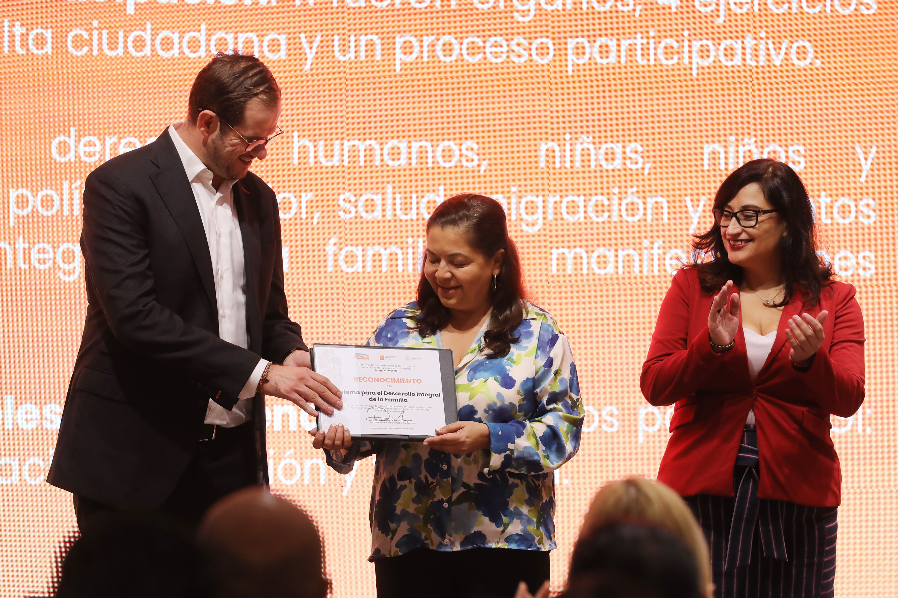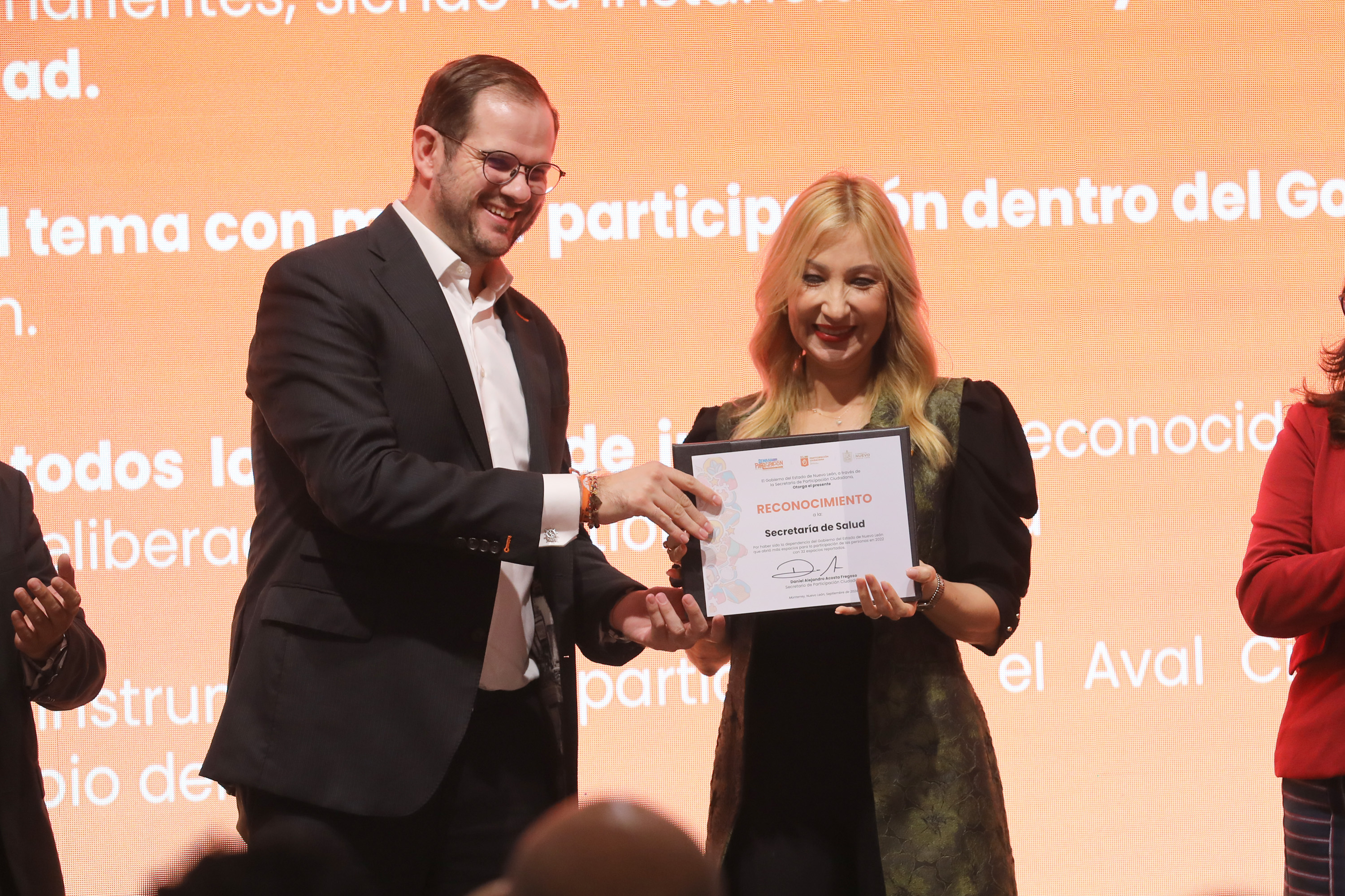 El Secretario de Participación Ciudadana entregó un reconocimiento al Secretario de Medio Ambiente, Alfonso Martínez Muñoz, por la apertura de once nuevos espacios de participación ciudadana; a la Directora del DIF Nuevo León, Gloria Ivette Bazán Villarreal por 17 nuevos espacios y la titular de Salud en el estado, Alma Rosa Marroquín Escamilla con 32 espacios reportados.