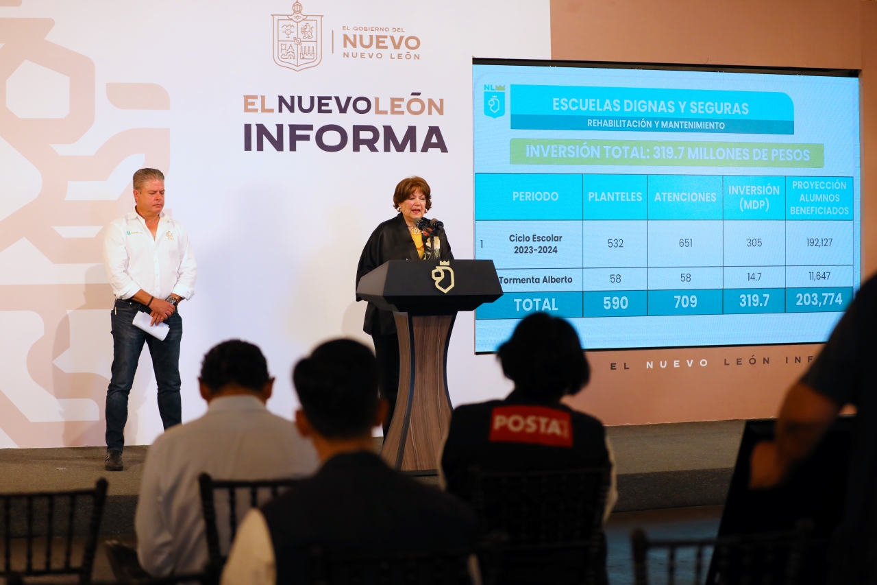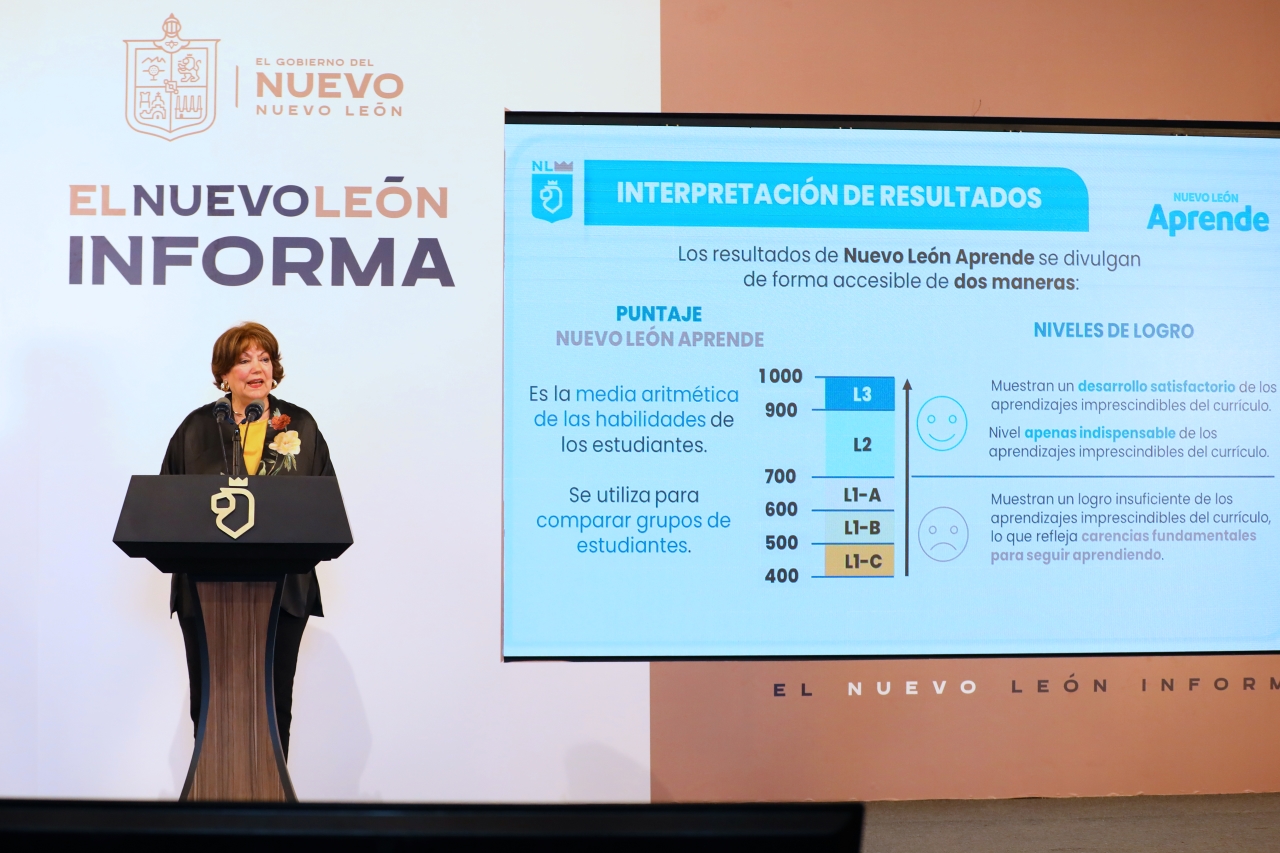 Durante su presentación, la Secretaria de Educación reveló que tras tres años de aplicar la evaluación Nuevo León Aprende, continúa la mejora en las áreas de Lenguaje y Comunicación, y Matemáticas en alumnos y alumnas de Educación Básica.
