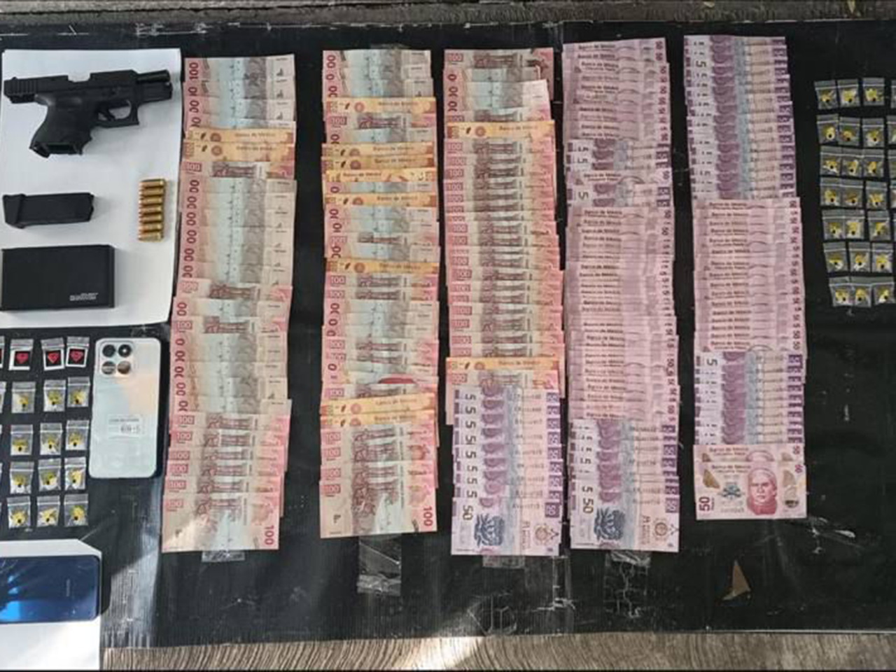 El varón se identificó como José “N”, de 34 años de edad, quien iba acompañado de una mujer identificada como Keila “N”, de 32. A ambos se les solicitó realizarles una revisión precautoria a sus pertenencias, encontrado un arma corta abastecida con siete balas; 15,050 pesos en efectivo, dos básculas digitales; 70 dosis de una sustancia parecida al cristal; 16 con un polvo parecido a la cocaína, tres celulares y dos básculas digitales.