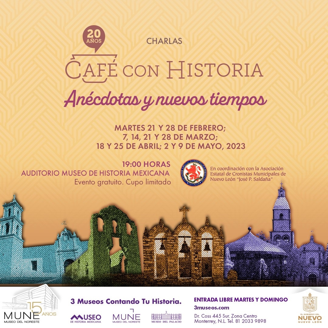 Café con Historia es un programa del Museo de Historia Mexicana en coordinación con la Asociación Estatal de Cronistas Municipales de Nuevo León “José P. Saldaña”, para este nuevo ciclo participan los municipios de Vallecillo, Escobedo, Pesquería, Juárez, Los Herreras, Guadalupe, General Terán, Dr. Arroyo, Abasolo y Galeana.