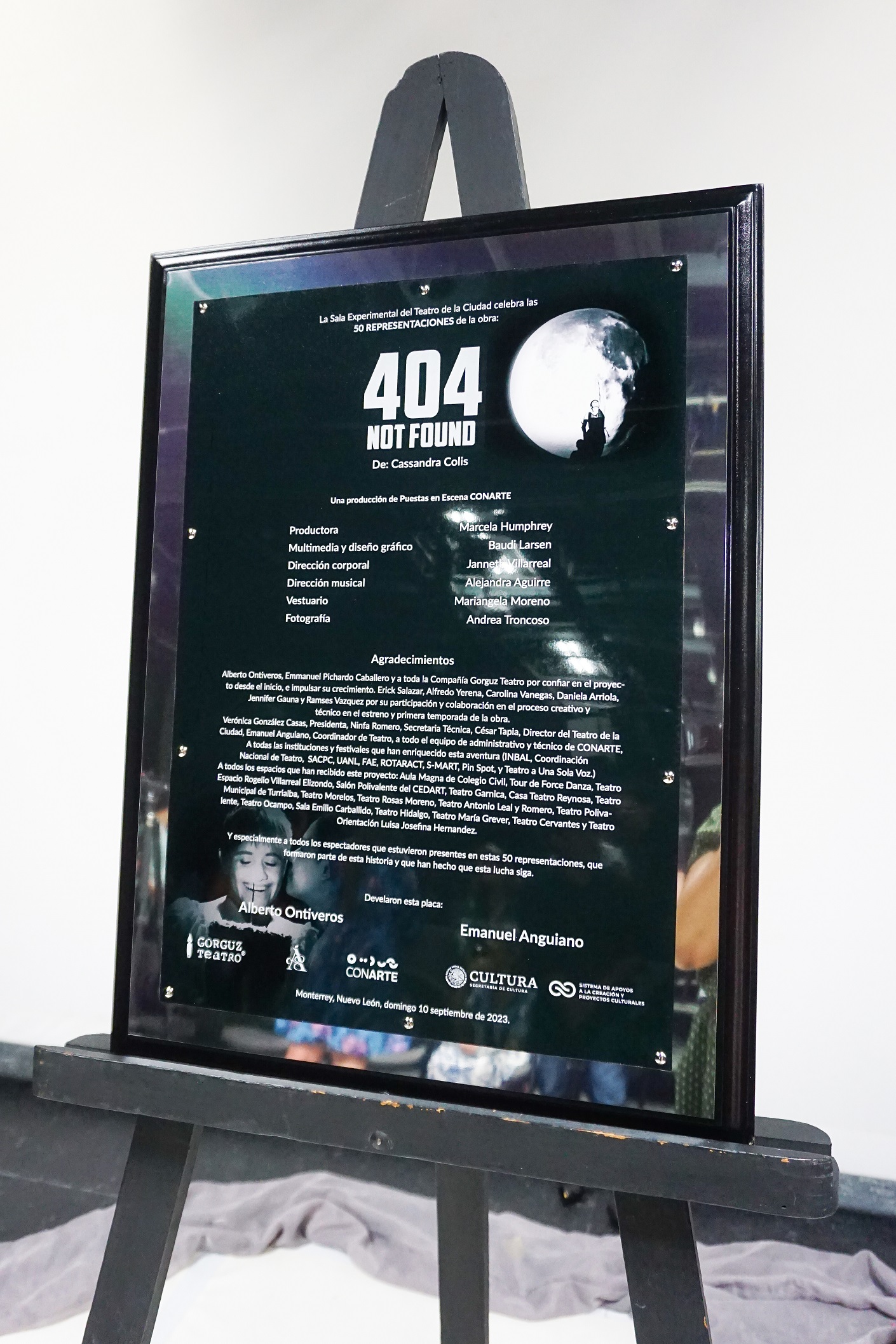 Al finalizar la función número 50 en la Sala Experimental del Teatro de la Ciudad | CONARTE, se develó una placa conmemorativa, el teatrista Alberto Ontiveros y Emanuel Anguiano, coordinador de Teatro de CONARTE, fueron los padrinos de develación; en el evento también estuvieron presentes: Ninfa Romero Medellín, Secretaria Técnica de CONARTE y César Tapia, Director del Teatro de la Ciudad | CONARTE.