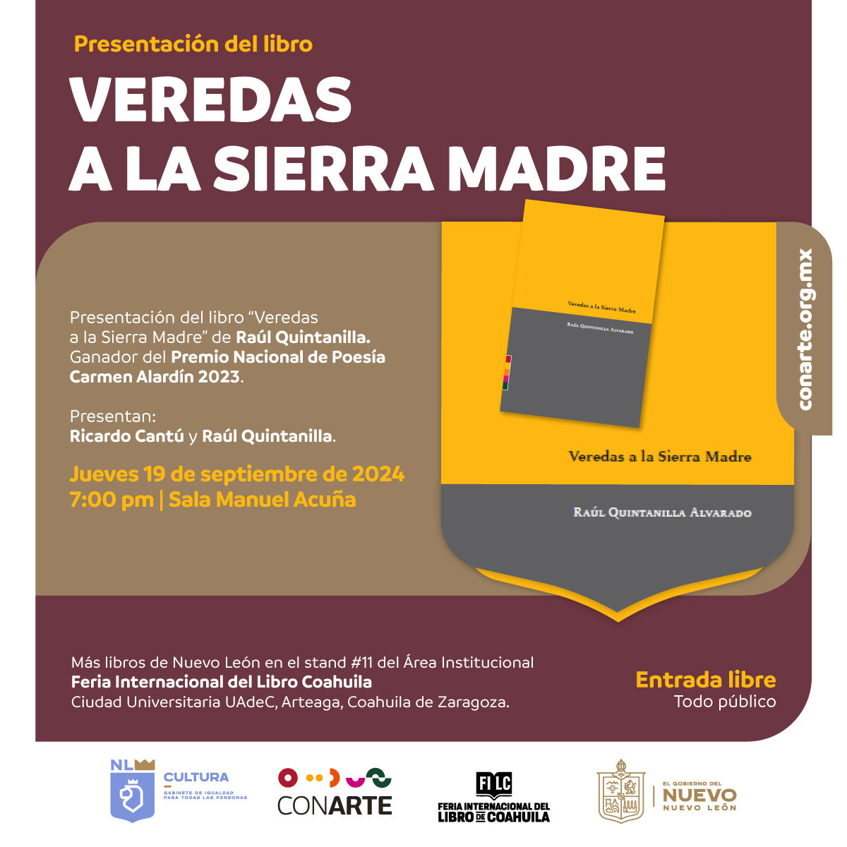Con un total de mil 200 ejemplares de más de 100 títulos editados y coeditados por CONARTE, la oferta editorial en esta edición incluye el título “Veredas a la Sierra Madre”, de Raúl Quintanilla”, ganador del Premio Nacional de Poesía Carmen Alardín 2023, que se presentará el jueves 19 de septiembre a las 19:00 horas en la Sala Manuel Acuña del recinto ferial, por el politólogo Ricardo Cantú.