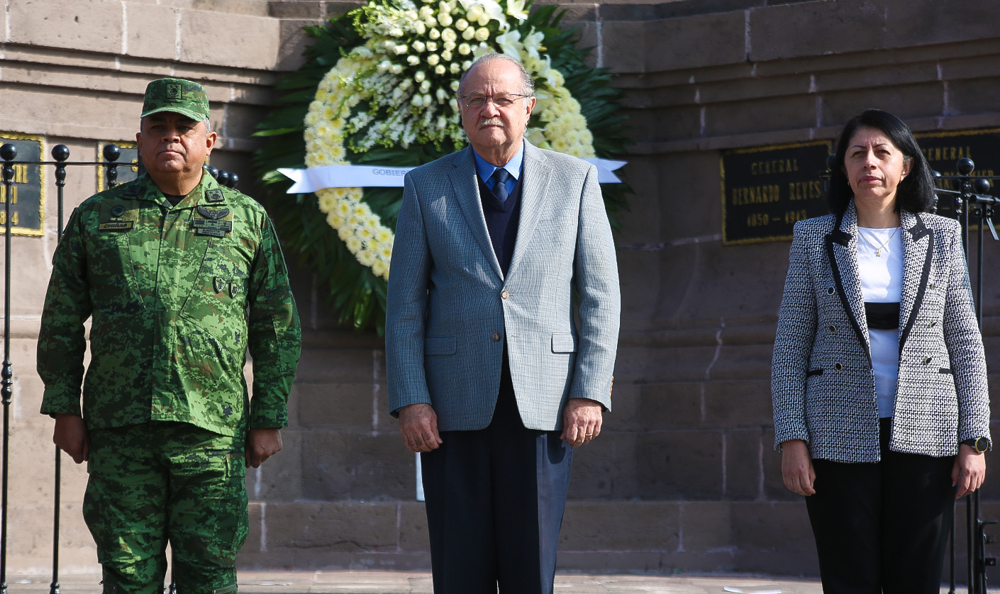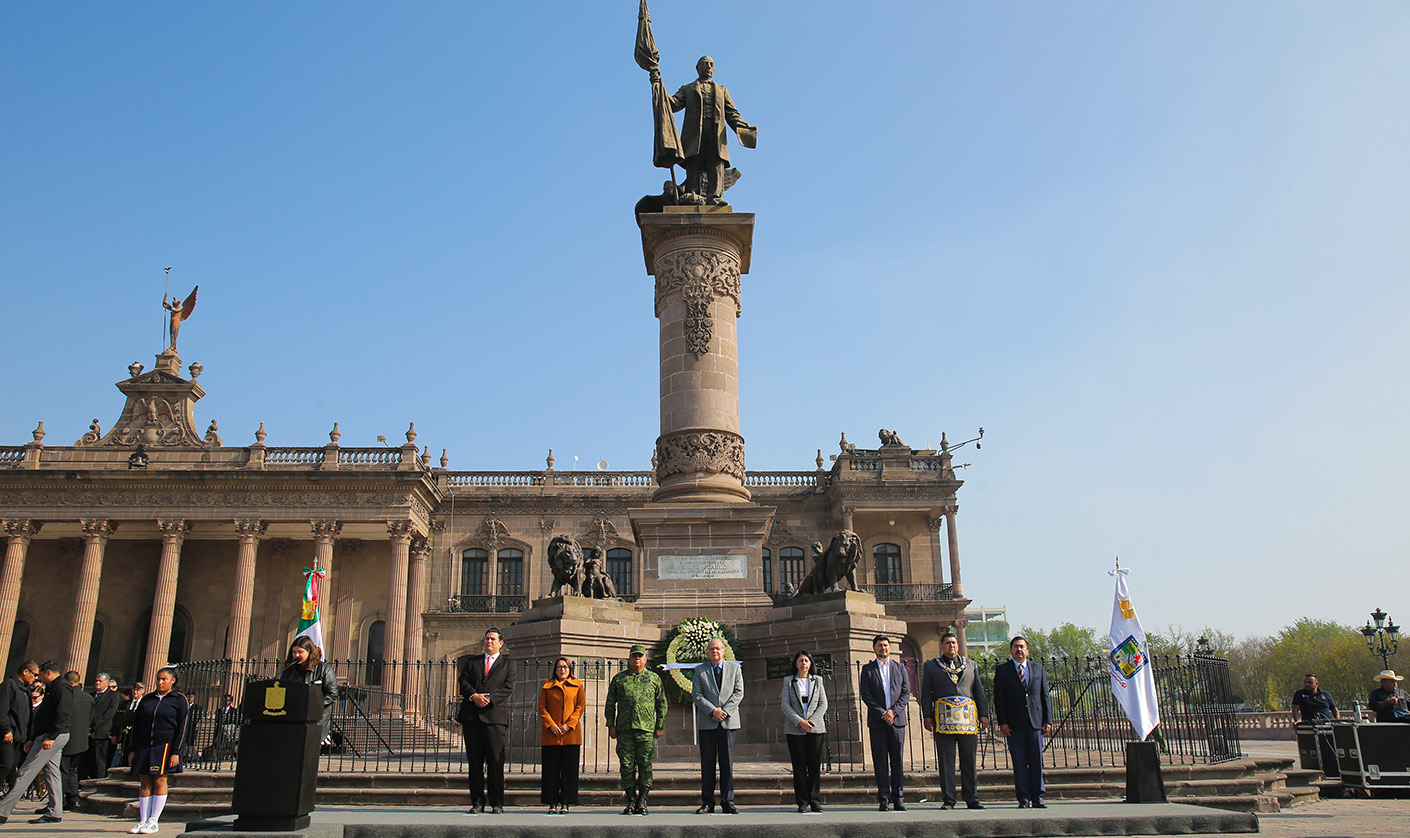Monterrey, Nuevo León.- Autoridades de los tres niveles de gobiernos encabezadas por el Secretario General de Gobierno, Javier Navarro, conmemoraron el 217 Aniversario del Natalicio de Don Benito Juárez García.