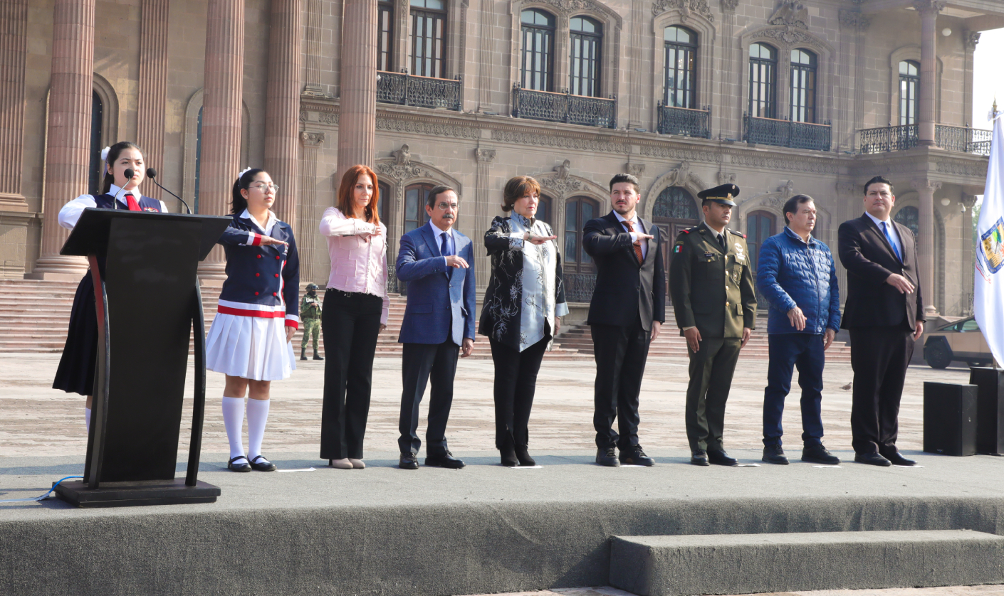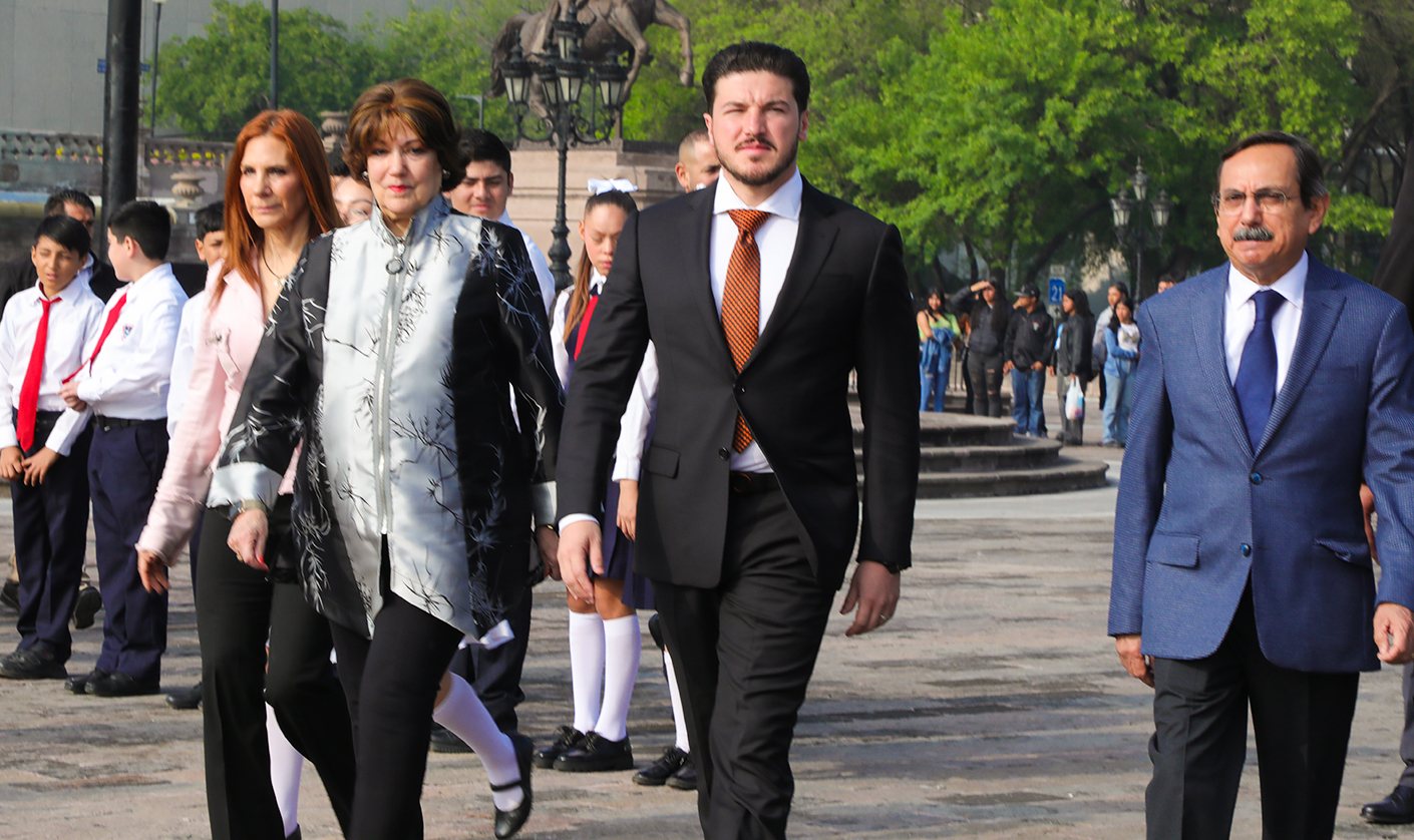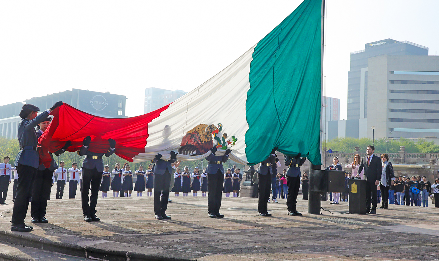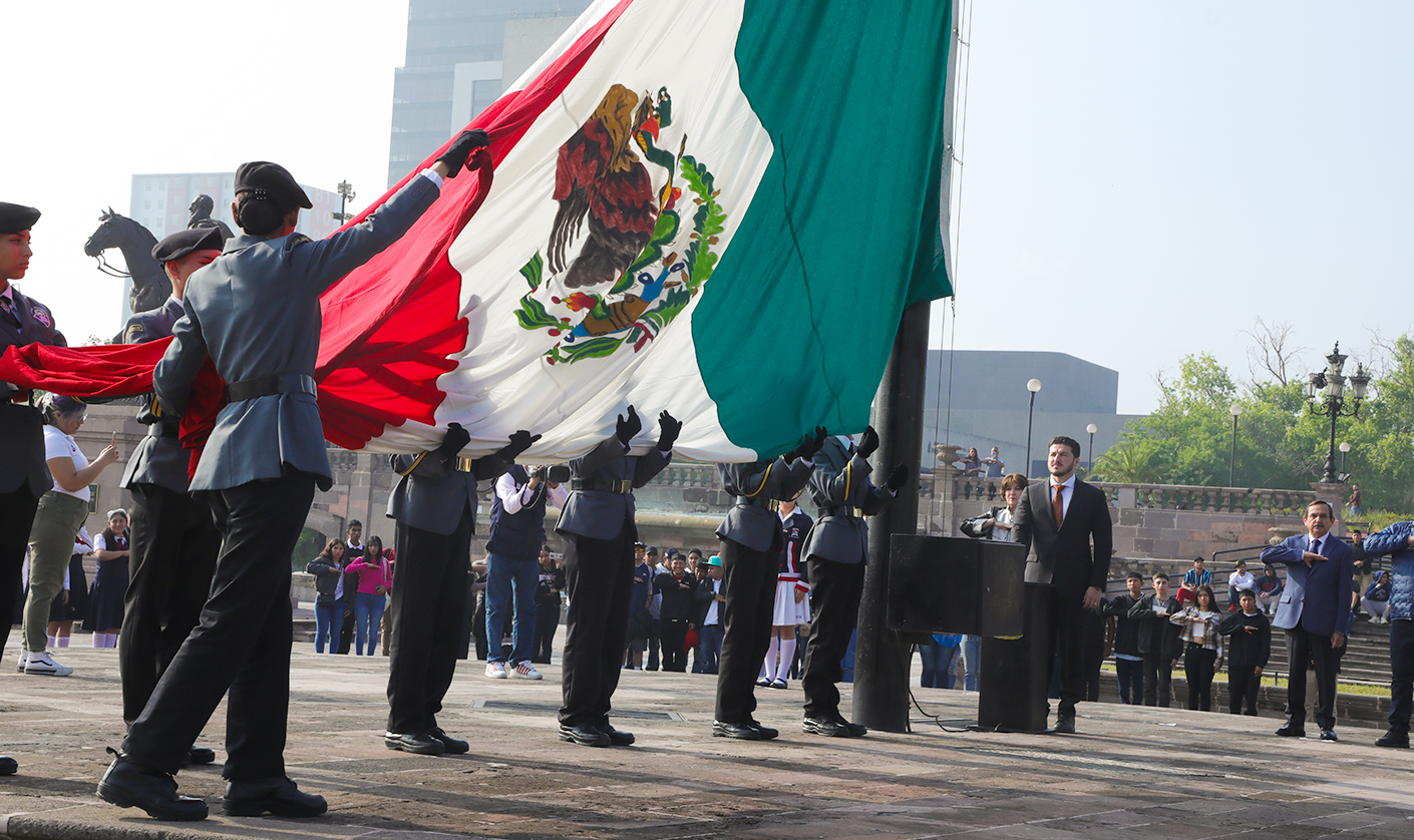 En la Explanada de los Héroes el Mandatario neolonés izó la Bandera Monumental y montó una Guardia de Honor ante el Monumento del Benemérito de las Américas acompañado de funcionarios estatales, federales, municipales y mandos militares.