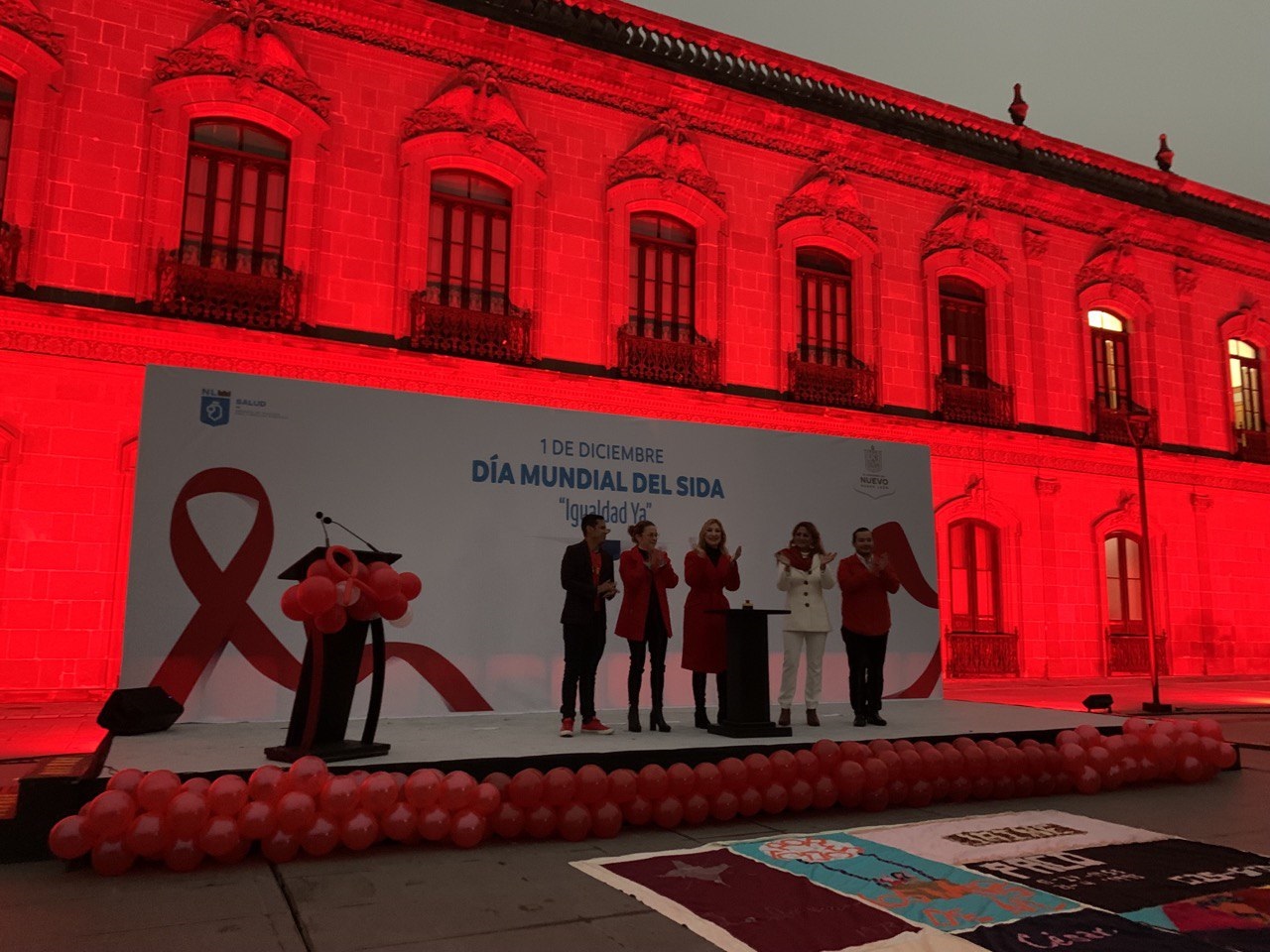 El Palacio de Gobierno de Nuevo León se iluminó en color rojo con motivo de la conmemoración del Día Mundial del Sida, que este año tiene como lema “Igualdad Ya”.