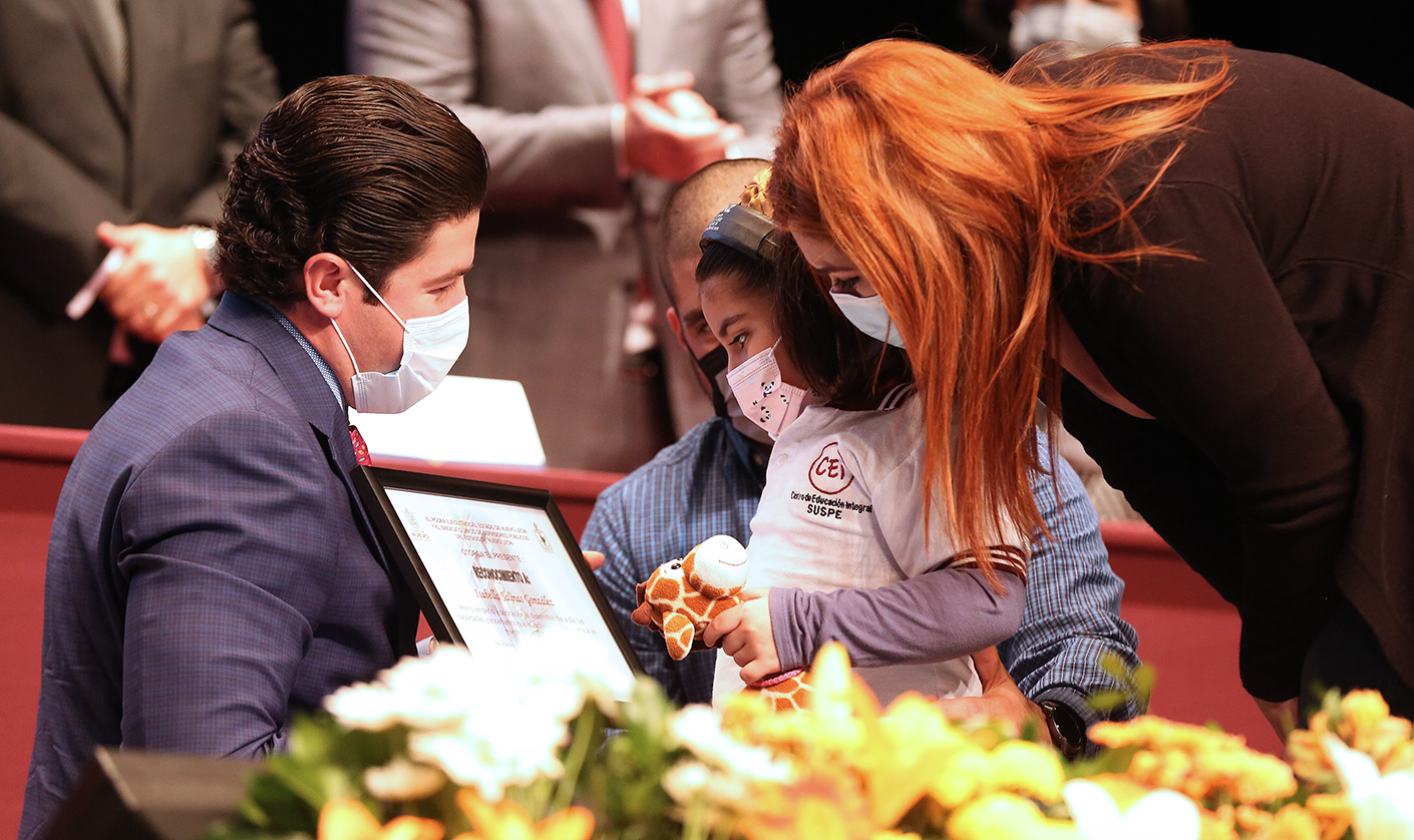 En el evento el Gobernador entregó reconocimientos por sus habilidades educativas a las niñas Isabela Salinas González y Fátima María Martínez Hernández, quienes asisten al Centro de Educación Integral del SUSPE.