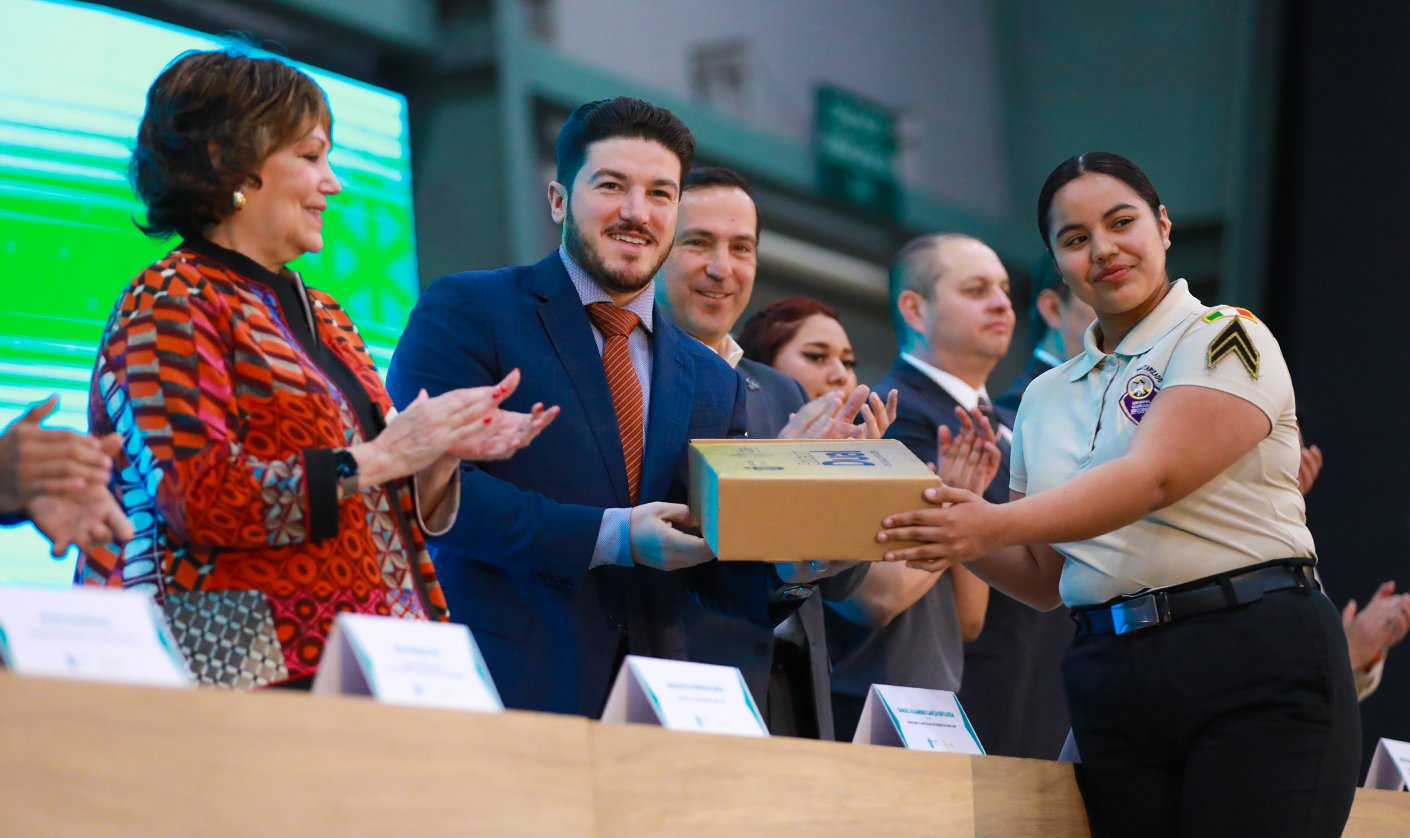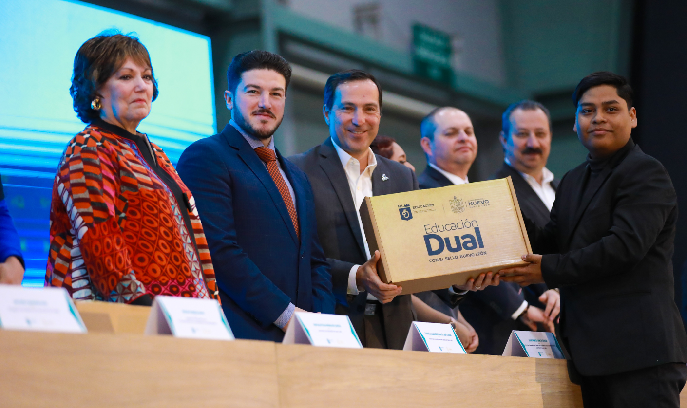 Monterrey, Nuevo León.- En el marco de la entrega de mil 900 computadoras a jóvenes de educación media superior y superior, el Gobernador Samuel Alejandro García Sepúlveda señaló que se busca que la educación dual sea obligatoria en la entidad.