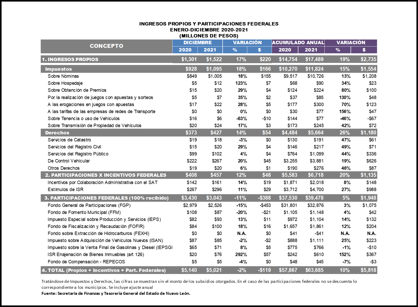 Durante 2021, los ingresos totales del Gobierno de Nuevo León, compuestos por ingresos propios y por participaciones federales, sumaron 63 mil 685 millones de pesos, cantidad 10 por ciento mayor a la registrada durante 2020, informó el Secretario de Finanzas y Tesorero General del Estado, Carlos Garza Ibarra.