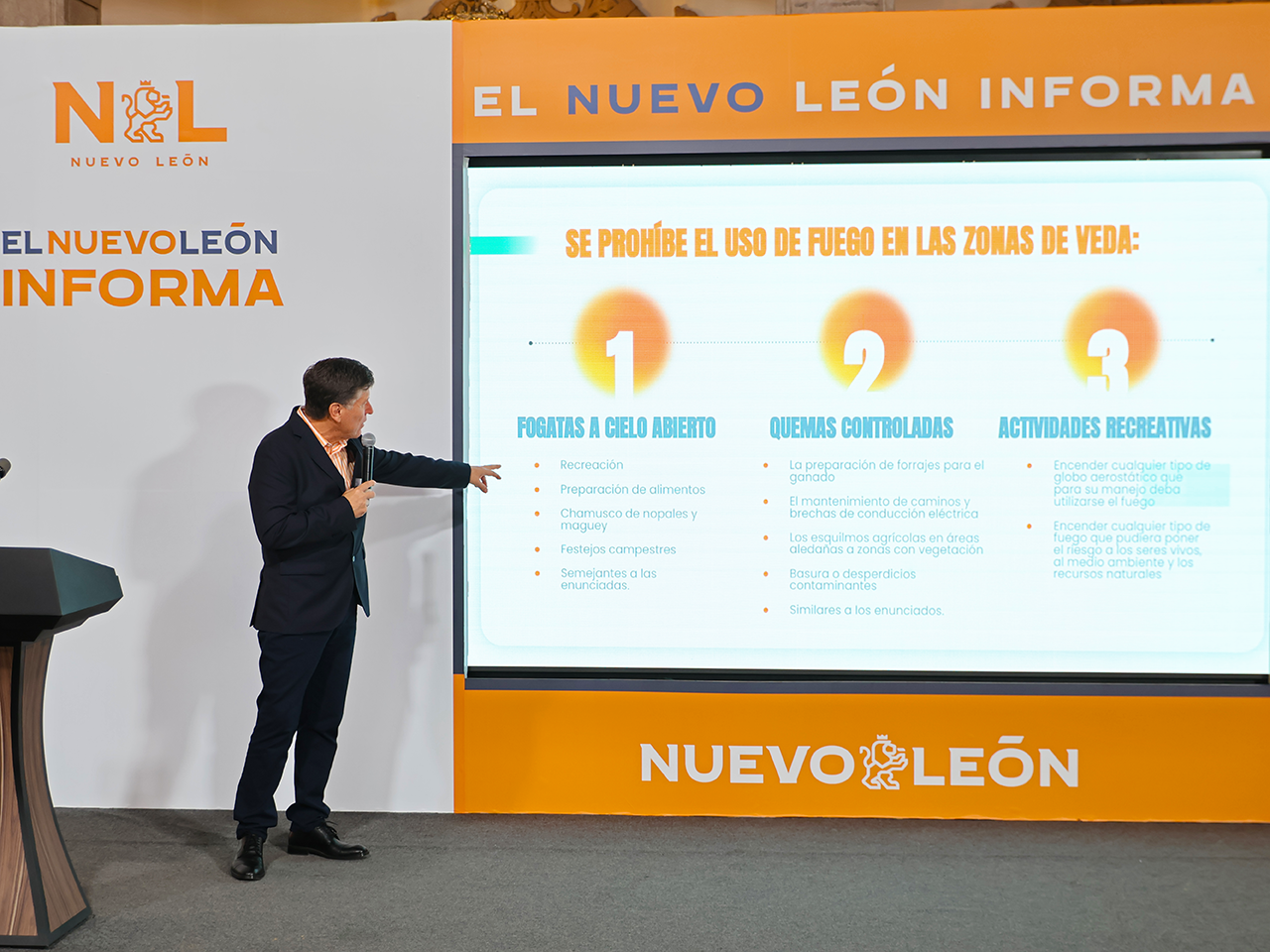 El titular de Medio Ambiente explicó que a través de este decreto se prohíbe el uso de fuego en zonas de veda que aparecen en un mapa que se anexa al decreto, y entre las prohibiciones en estas zonas se encuentran fogatas a cielo abierto, quemas controladas y actividades recreativas.