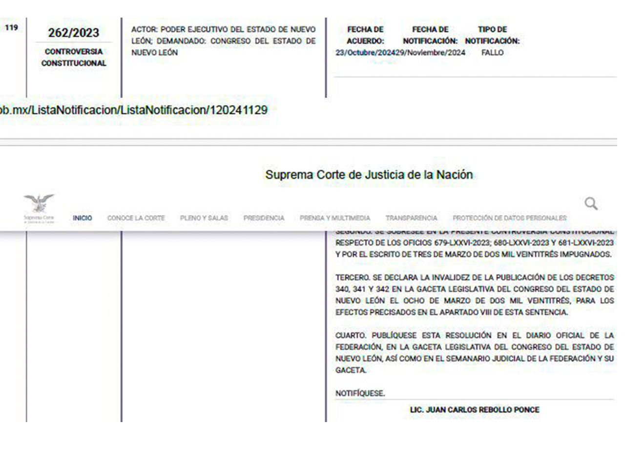 Monterrey, Nuevo León.- El día de hoy se notificó por lista al Congreso del Estado y al titular del Poder Ejecutivo el engrose de la Controversia Constitucional 262/2023, en donde el Poder Ejecutivo pidió la intervención de la Suprema Corte, por la publicación de Reformas a la Constitución del Estado de Nuevo León en la Gaceta Legislativa de manera ilegal e inconstitucional por parte del Congreso Local.
