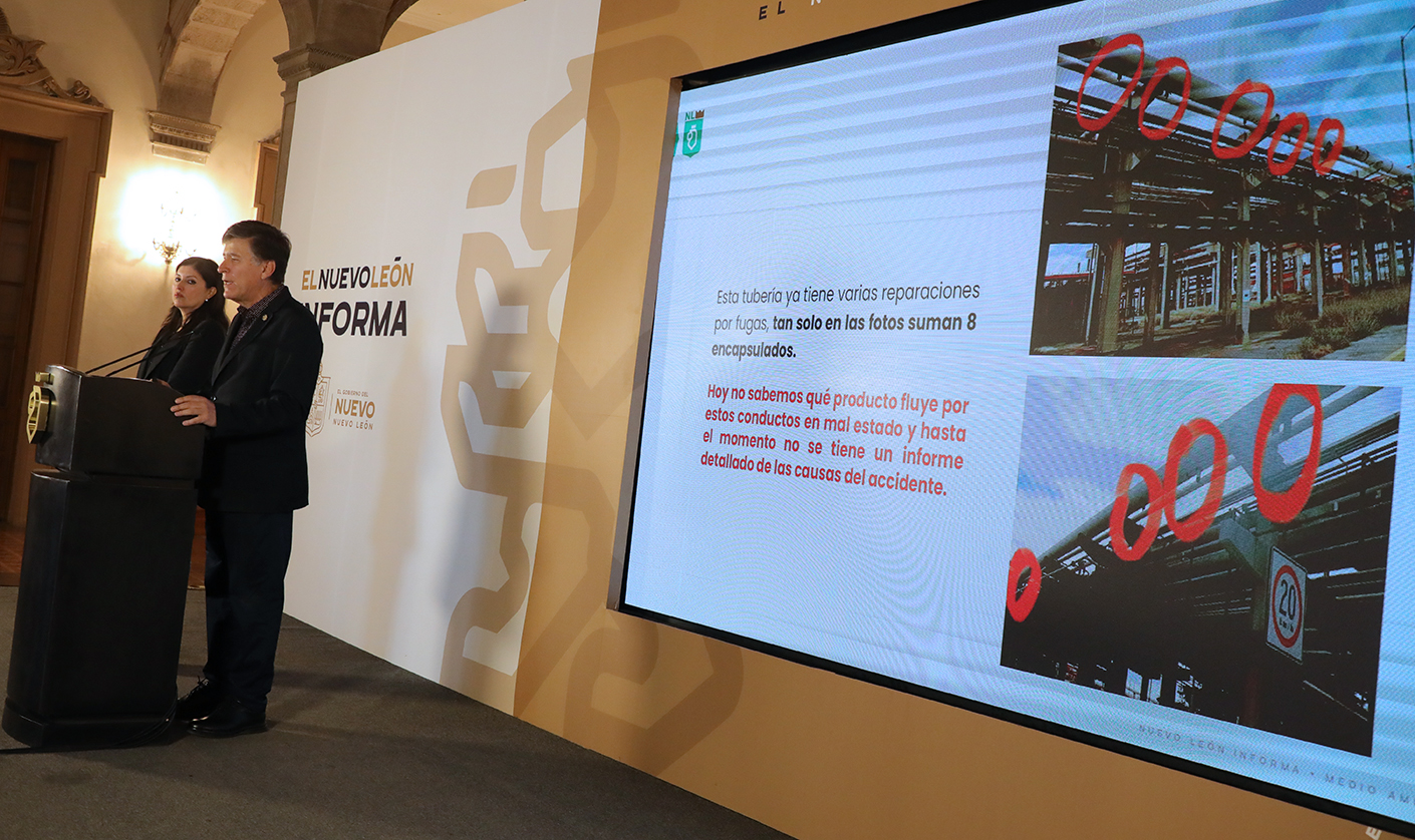 En el Nuevo León Informa el Secretario de Medio Ambiente, Alfonso Martínez Muñoz, acompañado de la directora de la Agencia de la Calidad del Aire, Armandina Valdez Cavazos, explicó que esas tuberías se van desgastando con el tiempo dependiendo los años que se tengan, y dependiendo el tipo de producto que esté pasando por las mismas.