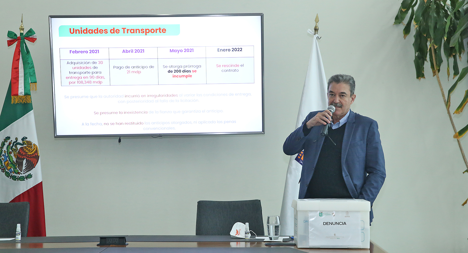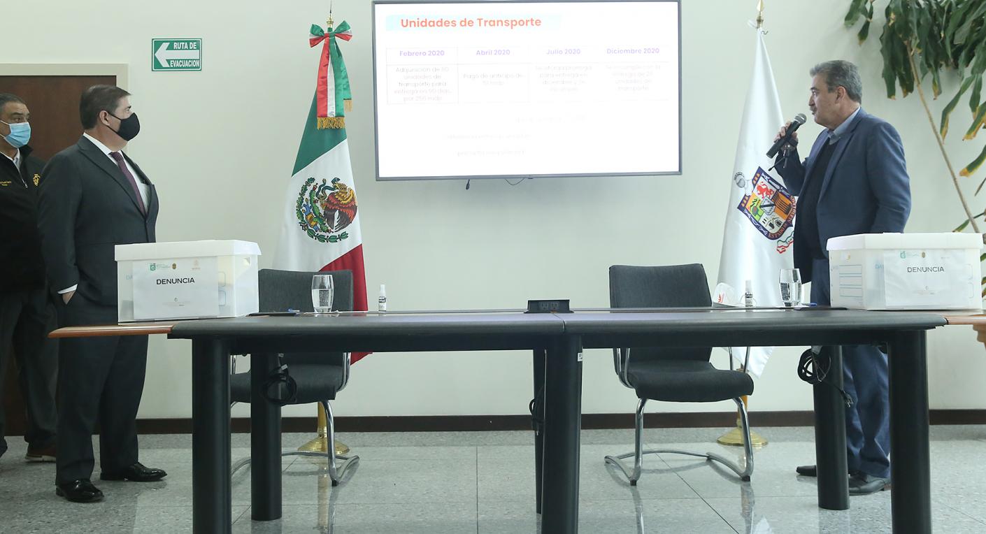 “Se pagó un anticipo de 51 millones de pesos y se otorgó una prórroga para entrega en diciembre, pero se incumple con la entrega de 25 unidades de transporte”, dijo Villarreal.