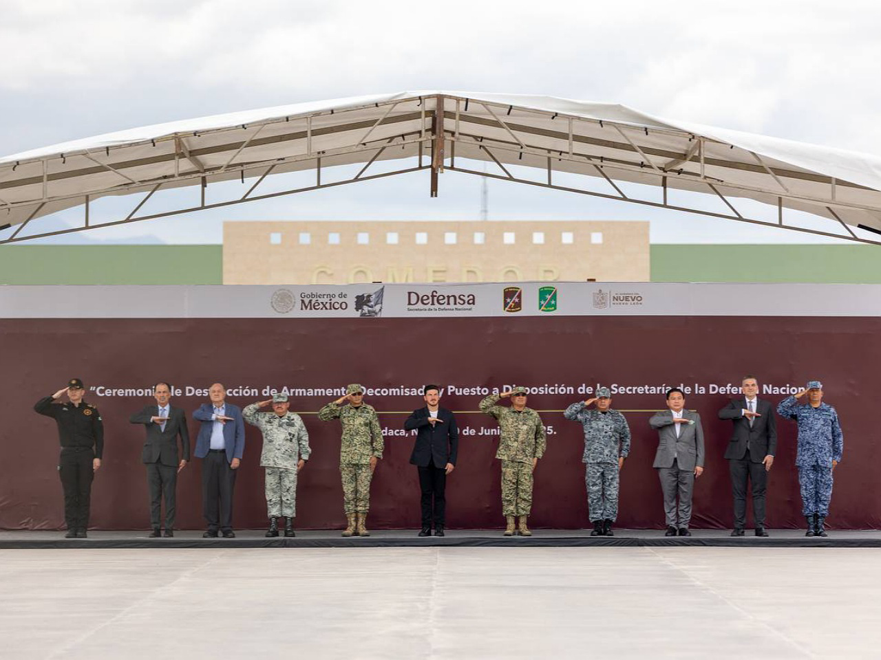 Previo a la Destrucción de armamento por parte de la Secretaría de la Defensa Nacional, el Mandatario estatal informó que Nuevo León logró reducir el delito de homicidio en un 65 por ciento en lo que va del mes de junio comparado con el mismo periodo del año pasado.