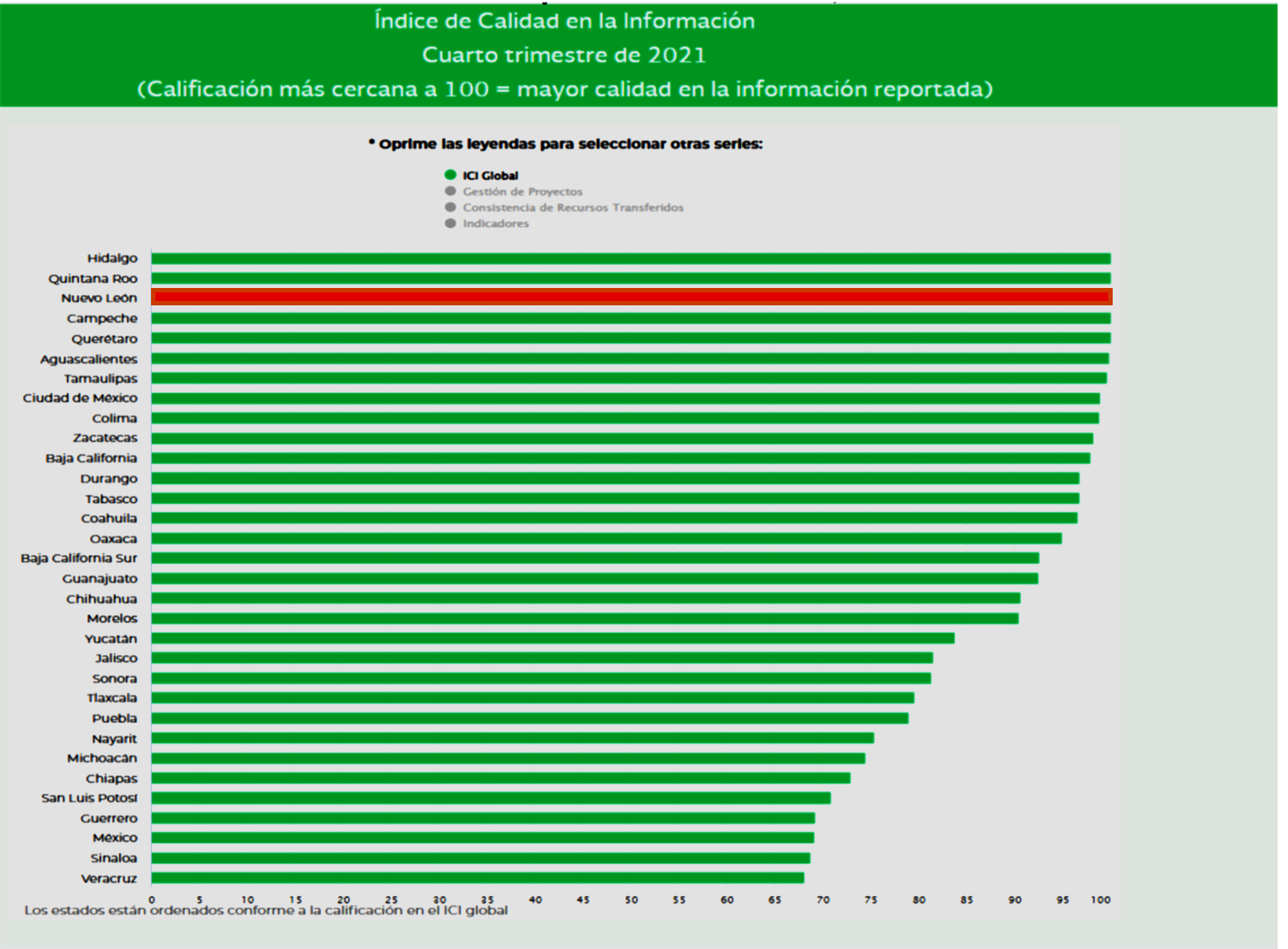 Nuevo León se colocó en segundo lugar nacional en la clasificación del Índice de Calidad en la Información (ICI) reportada sobre Recursos Federales Transferidos, en la evaluación correspondiente al cuarto trimestre de 2021. La calificación asignada a la entidad por la Secretaría de Hacienda y Crédito Público (SHCP) fue de 99.99 puntos de cien posibles. El promedio nacional fue de 88.12 puntos.
