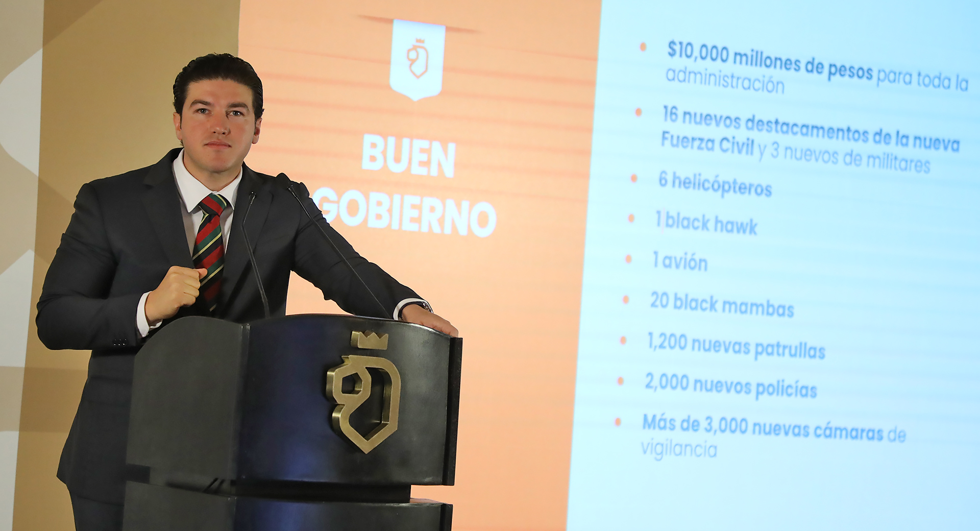 En seguridad la construcción de 8 nuevos destacamentos y un regimiento para blindar todas las entradas y salidas de Nuevo León, equipamiento, unidades, armamento; el C5 y más de 3 mil cámaras para la inteligencia.