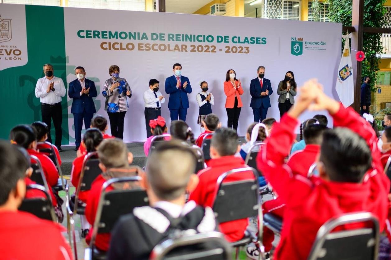 Tras encabezar la ceremonia de reinicio del Ciclo Escolar 2022- 2023 en la primaria Profesor J. Merced Garza Hinojosa, en la que estuvo acompañado por la Secretaria de Educación, Sofialeticia Morales, el Mandatario también señaló que el presupuesto es histórico y de beneficio para las y los estudiantes.