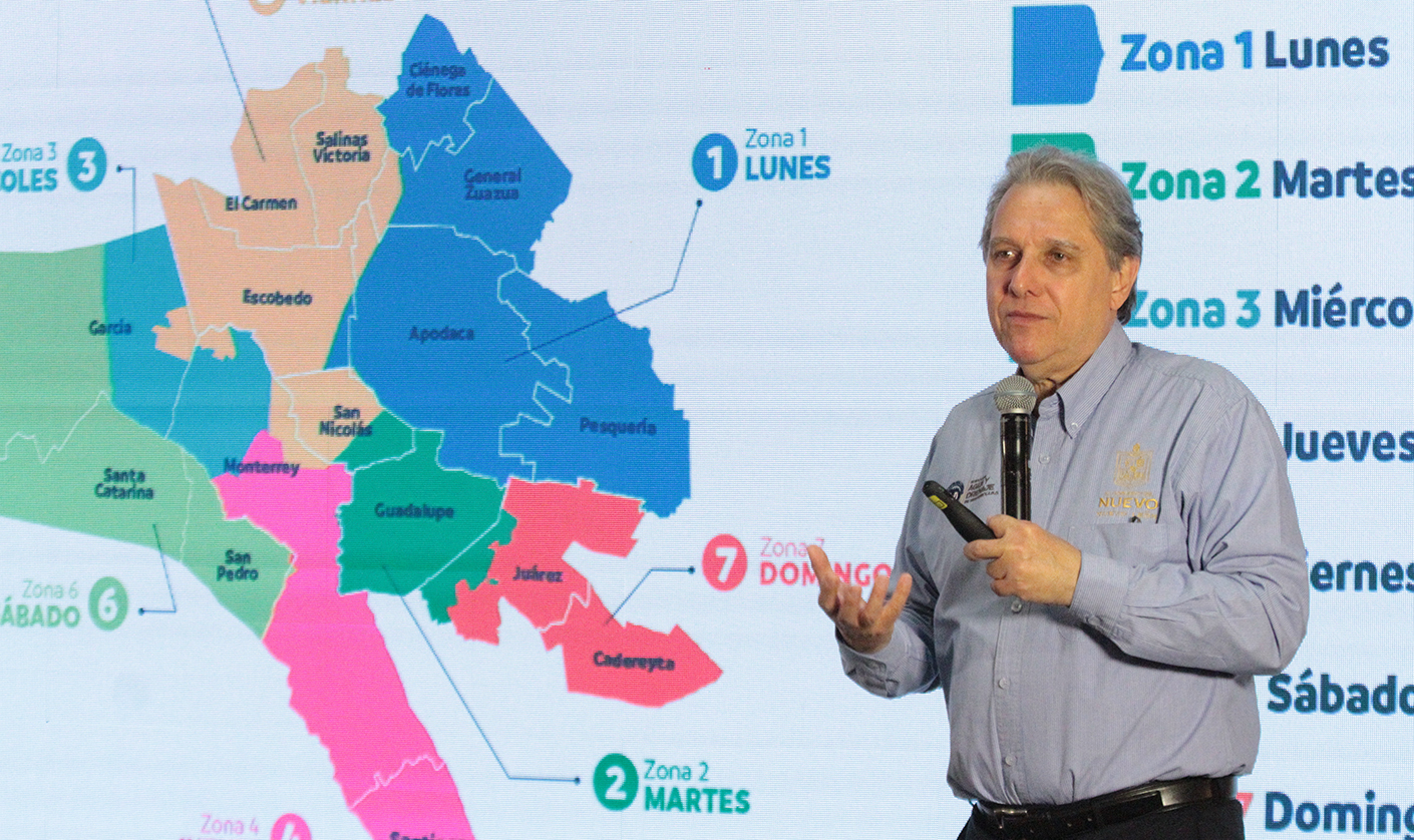 El lunes, que corresponde la zona uno (color azul), comprende todo el municipio de Ciénega de Flores y Pesquería; Zuazua y Apodaca casi en su totalidad y una parte de Escobedo.
