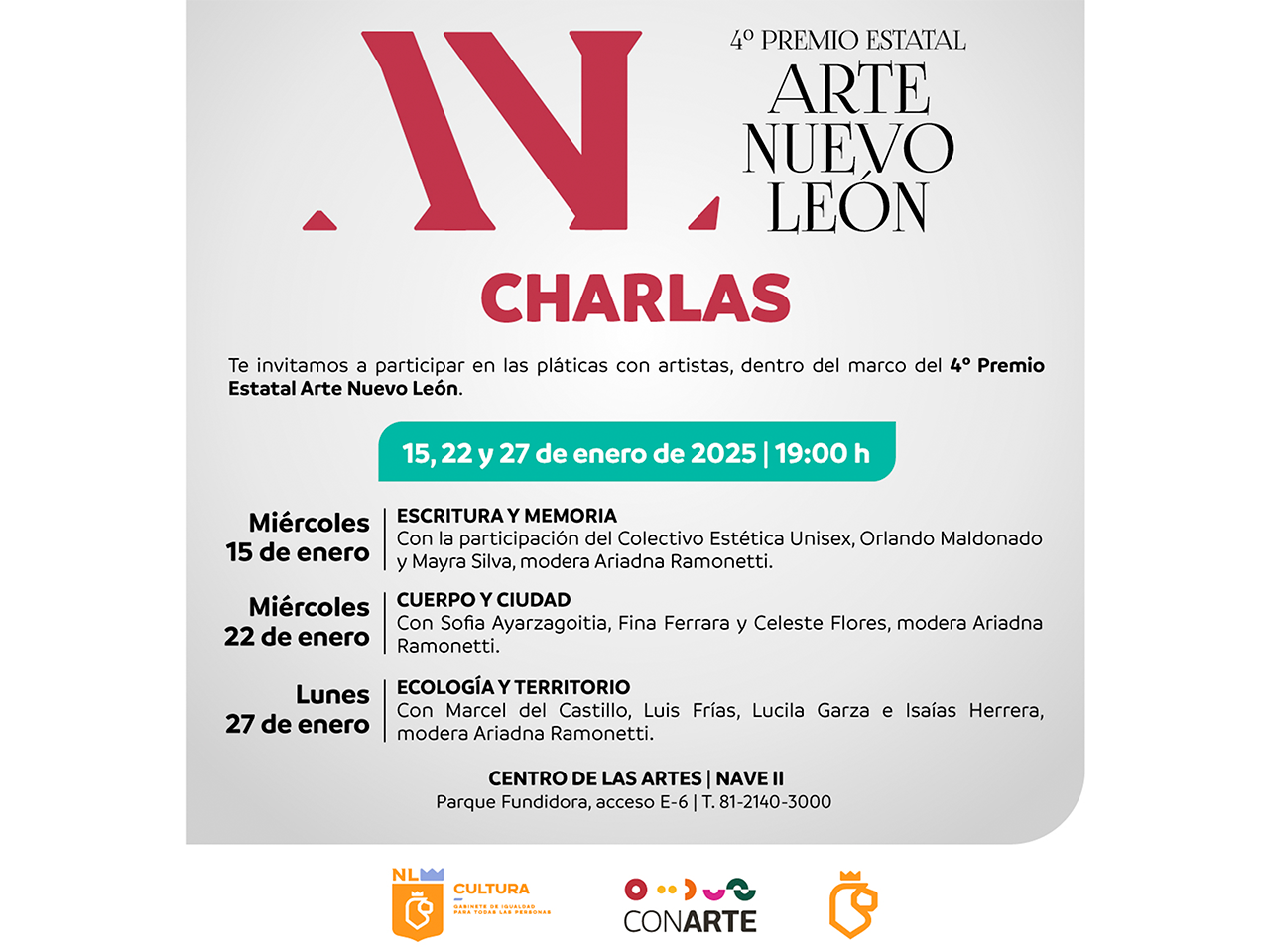 El miércoles 22 de enero se abordará el tema “Cuerpo y Ciudad”, charla en la que participarán las creadoras Sofía Ayarzagoitia, Fina Ferrara y Celeste Flores; el 27 de enero será “Ecología y Territorio”, con la participación de Marcel del Castillo, Luis Frías, Lucila Garza e Isaías Herrera. Más información en conarte.org.mx y redes sociales @conartenl.