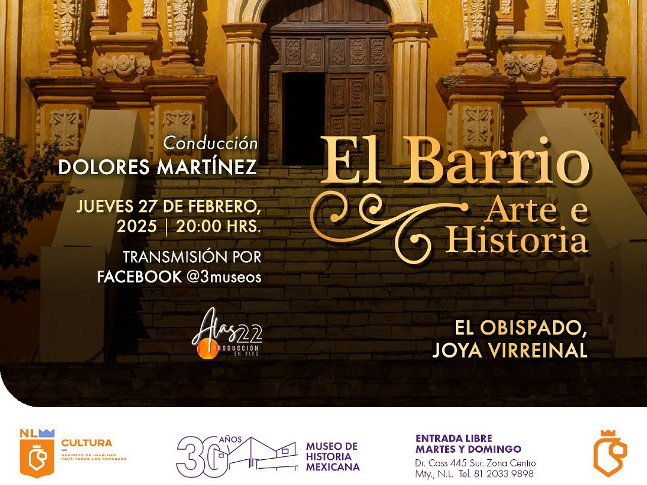 Además, Dolores Martínez compartirá sus vivencias en este recinto, un lugar que ha sido escenario de importantes momentos en su carrera artística y que sigue inspirando a generaciones con su belleza y simbolismo. "El Barrio. Arte e Historia, "El Obispado, Joya Virreinal" se transmitirá a través de la página de Facebook de 3 Museos el jueves 27 de febrero a las 20:00 horas, para más información puede consultar www.3museos.com