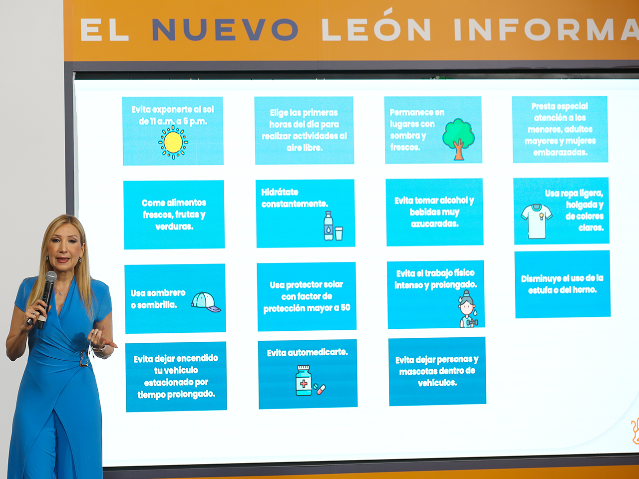 Monterrey, Nuevo León.- Ante las altas temperaturas pronosticadas esta semana por encima de los 40 grados centígrados, la Secretaria de Salud, Alma Rosa Marroquín dio a conocer recomendaciones para evitar afectaciones en la salud provocadas por el calor.