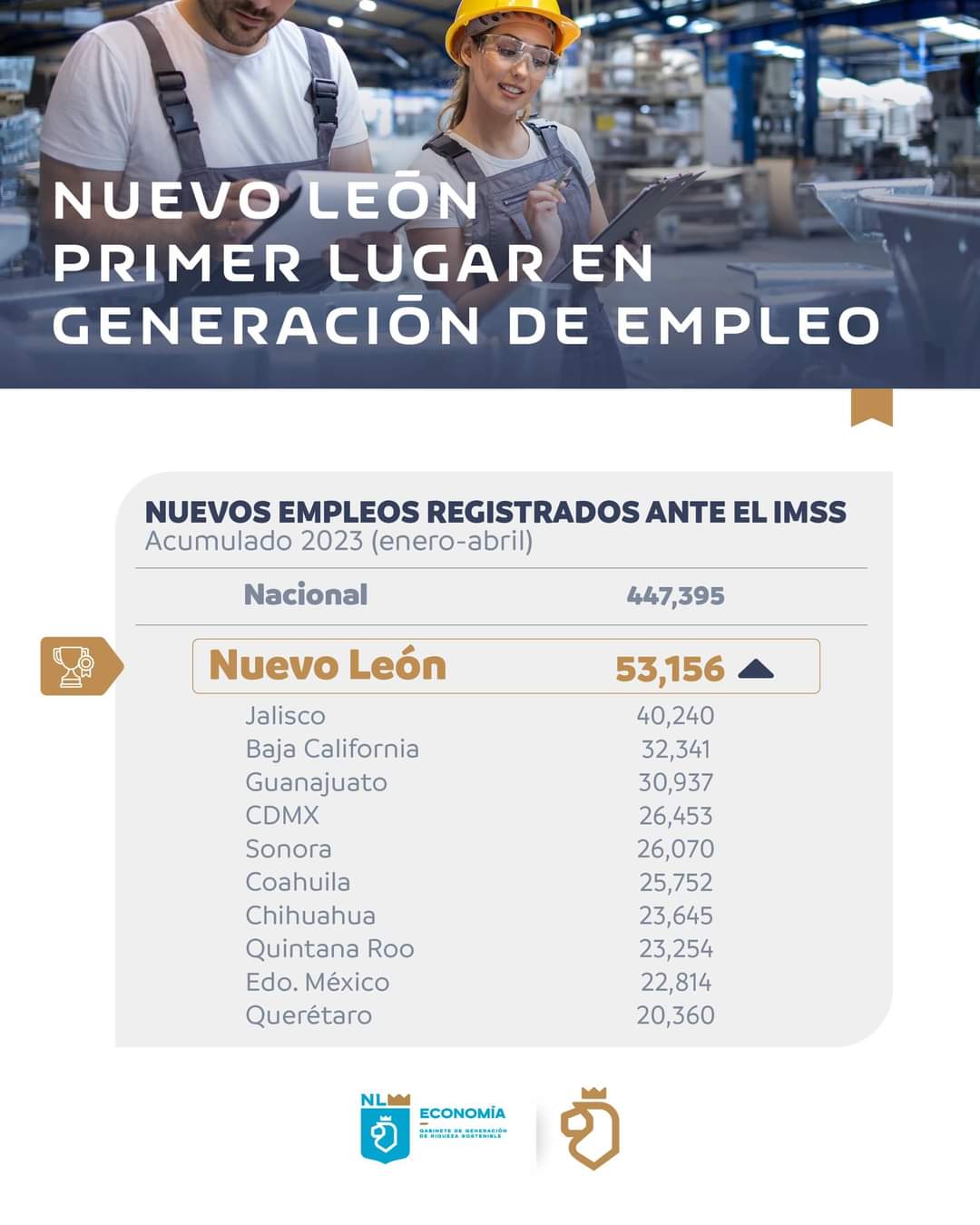 En empleo, sigue Nuevo León en primer lugar a nivel nacional en enero-abril 2023