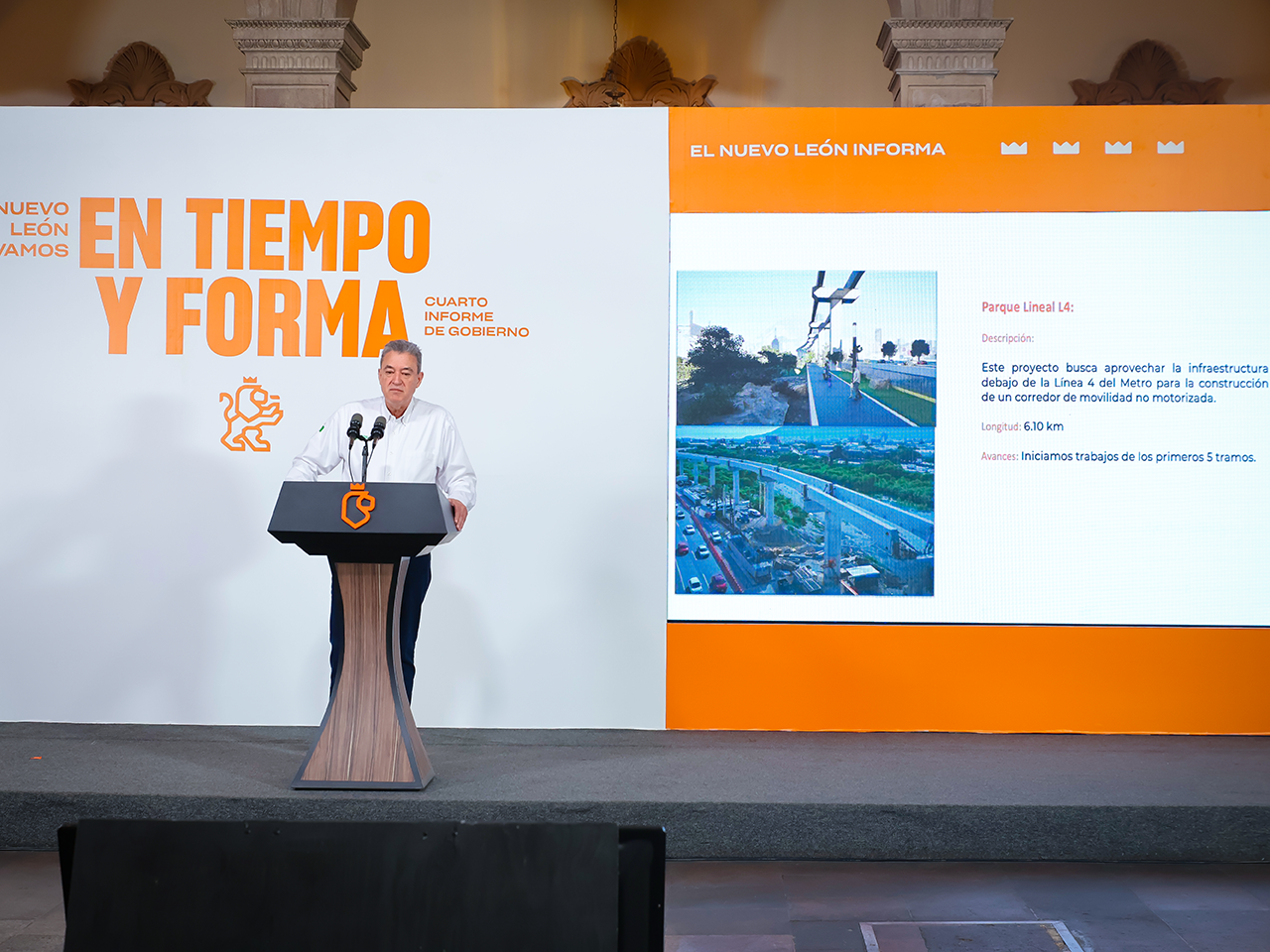Finalmente, Villarreal Rodríguez anunció proyectos que promueven la movilidad no motorizada, como el parque lineal bajo la Línea 4 del Metro, de 6.1 kilómetros, y los puentes peatonales sobre el río Santa Catarina, que unirán las estaciones Rise y Obispo sin afectar el entorno natural.