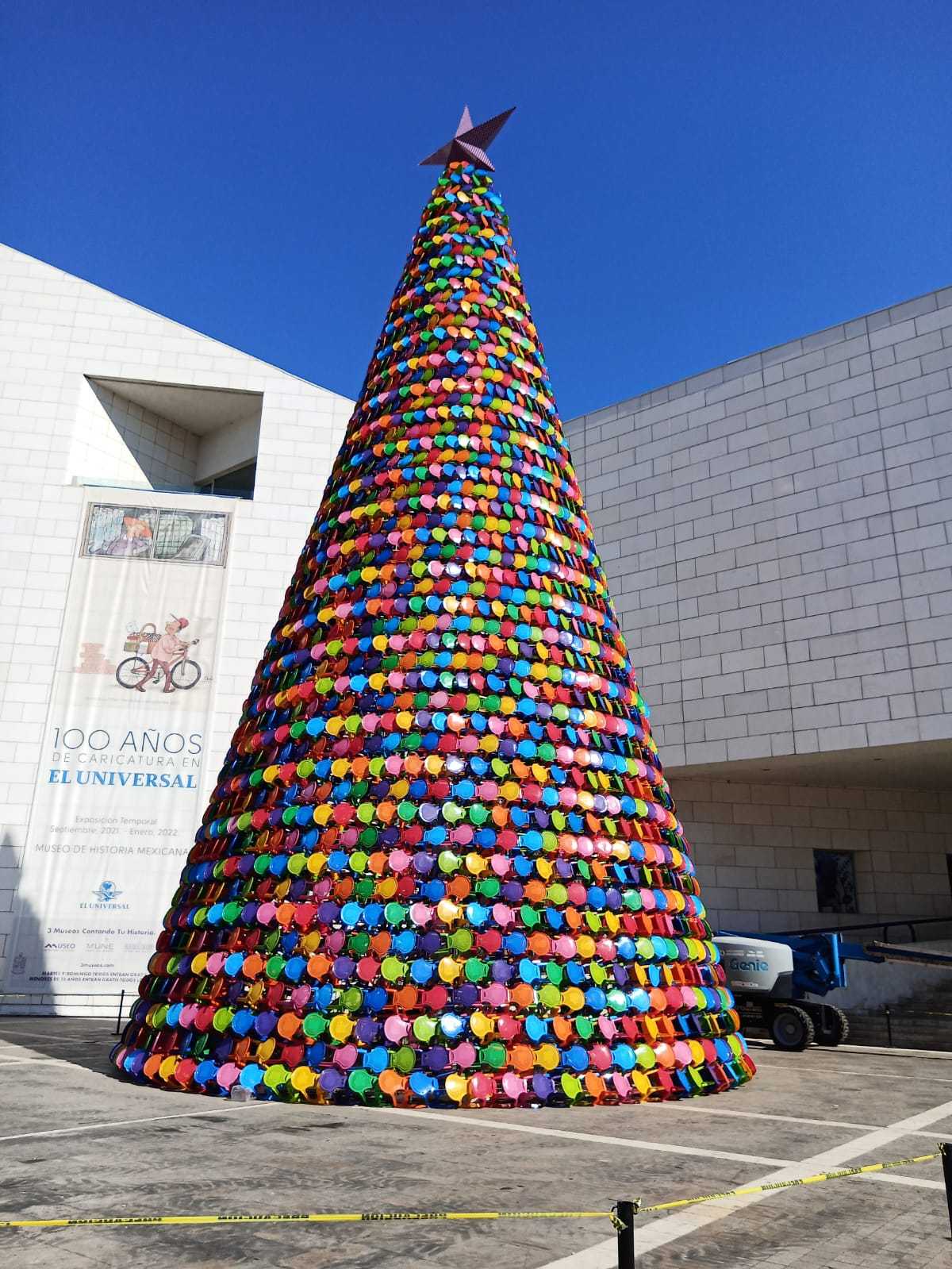 A simple vista, el pino ubicado frente a la fachada del Museo de Historia Mexicana, parece una gran obra de confitería, con brillantes colores que pueden apreciarse con la luz del día y por la noche las brillantes luces le darán una singular brillantez.