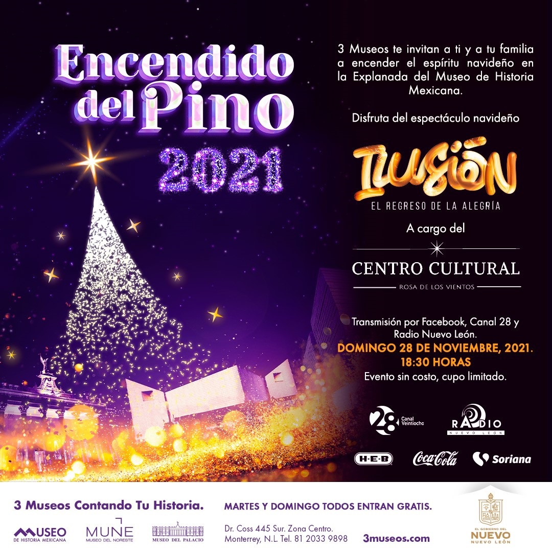 El encendido del Pino se llevará a cabo el domingo 28 de noviembre a partir de las 18:30 horas, estará abierto al público en general, pero el cupo estará restringido a las indicaciones de la Secretaría de Salud, para mayor información comuníquese a través de las redes sociales de 3 Museos.