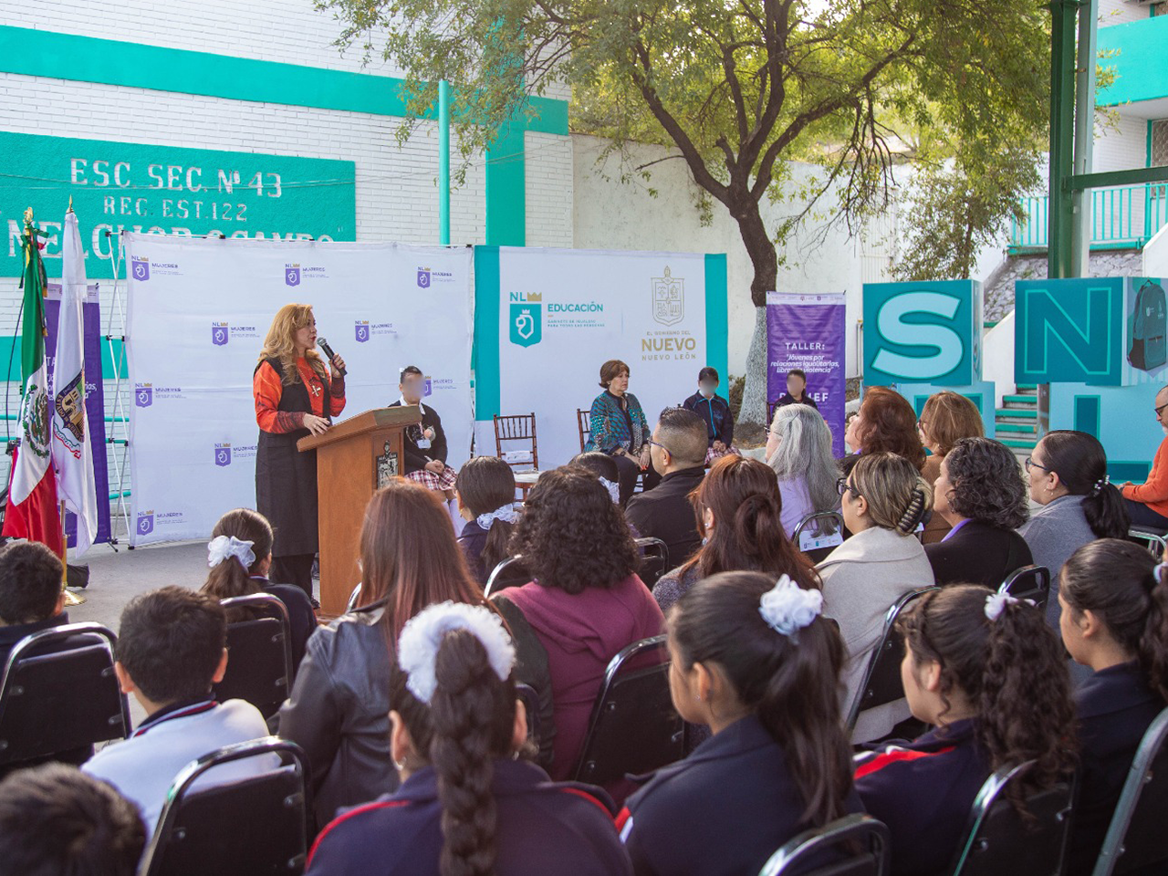 Sofialeticia Morales Garza, titular de la Secretaría de Educación y Graciela Buchanan Ortega, Secretaria de las Mujeres, encabezaron una ceremonia en la Secundaria 43 “Melchor Ocampo”, ubicada en la colonia Pío X. en Monterrey, donde explicaron los avances y los beneficios del programa “Jóvenes por Relaciones Igualitarias, Libres de Violencia”.