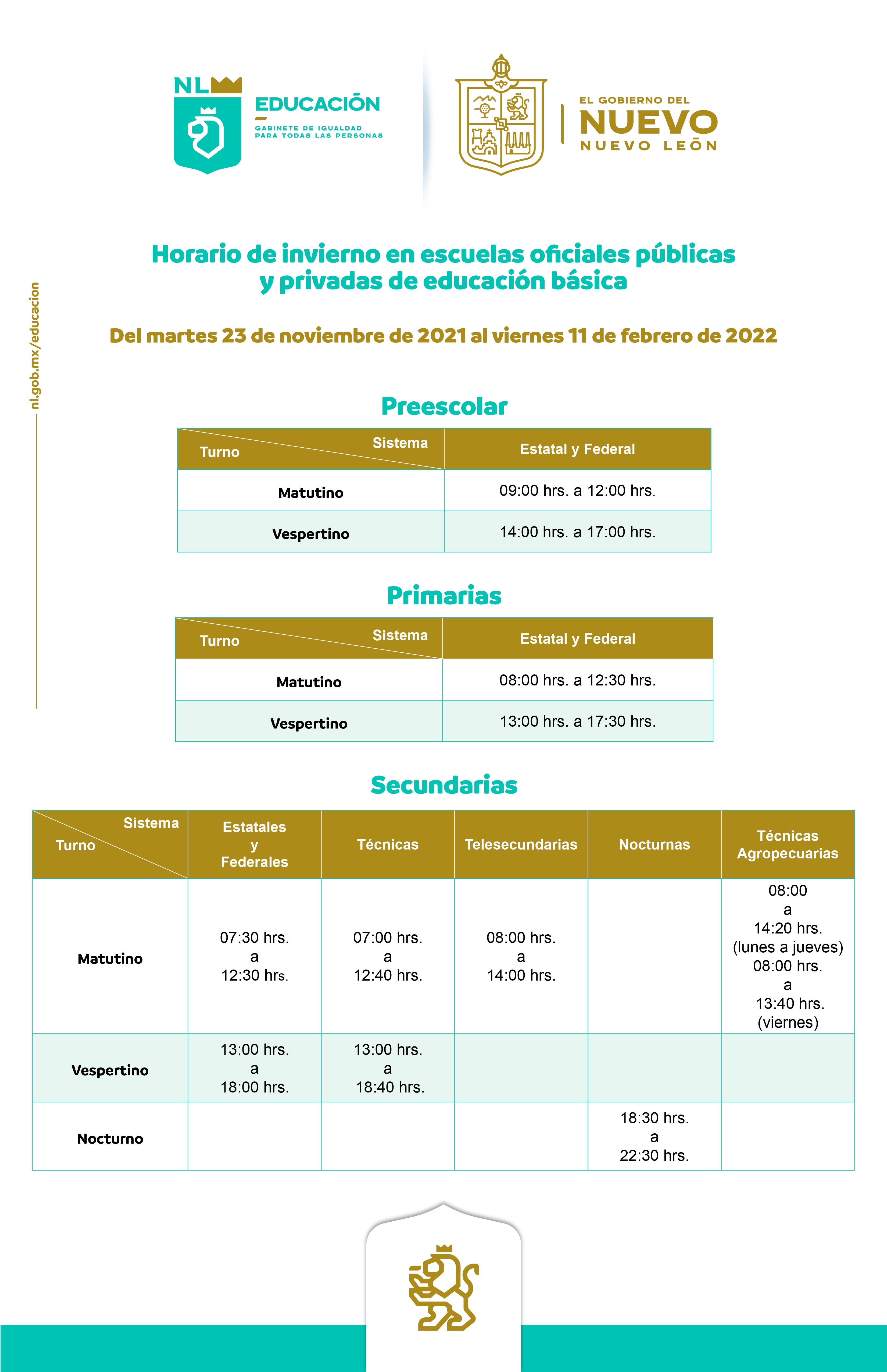La Secretaría de Educación de Nuevo León informa que este martes 23 de noviembre entrará en vigor el horario de invierno escolar para los planteles de la modalidad de atención presencial, mixta y a distancia.