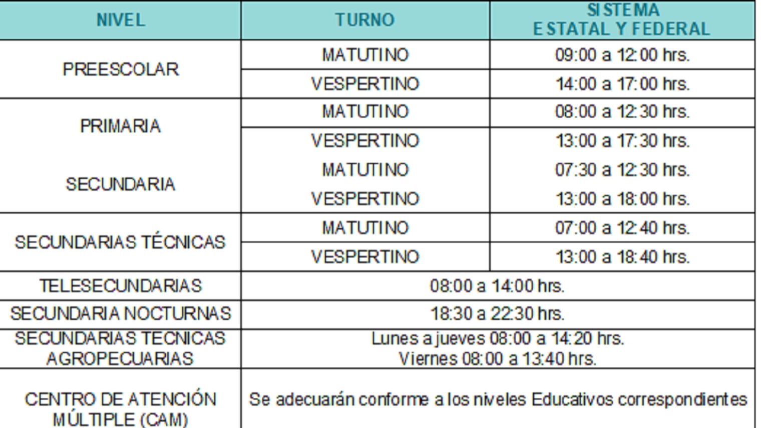 El personal directivo, docente, administrativo y de intendencia, deberá cubrir el horario regular de la jornada de trabajo. La dependencia reitera que, en caso de presentarse bajas temperaturas, queda a criterio de los padres de familia la asistencia de sus hijos al plantel escolar.