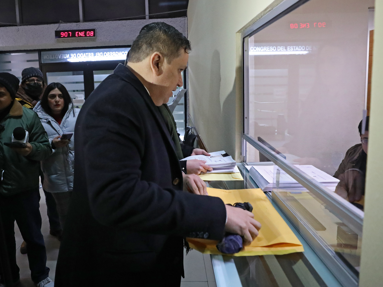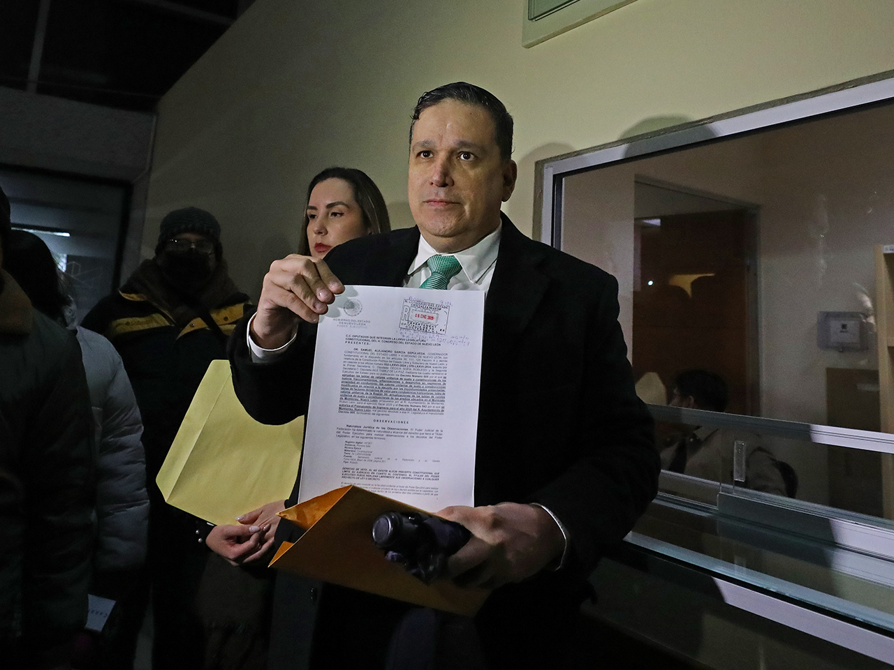Monterrey, Nuevo León.- El Consejero Jurídico del Titular del Poder Ejecutivo, Ulises Carlin de la Fuente entregó en la Oficialía de Partes del Congreso del Estado, el decreto del veto que realizó el Gobernador del Estado, Samuel Alejandro García Sepúlveda, al incremento del impuesto predial que plantea el Municipio de Monterrey.