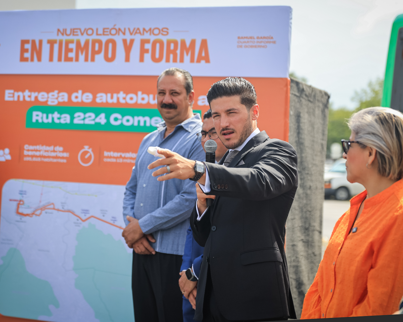"Tenemos 4 mil nuevos camiones, orgullosamente Volvo, Hecho en Nuevo León, con clima, internet, seguridad, botón de pánico y además Fuerza Civil de manera estratégica yendo a la ruta donde puede haber denuncias o delitos.