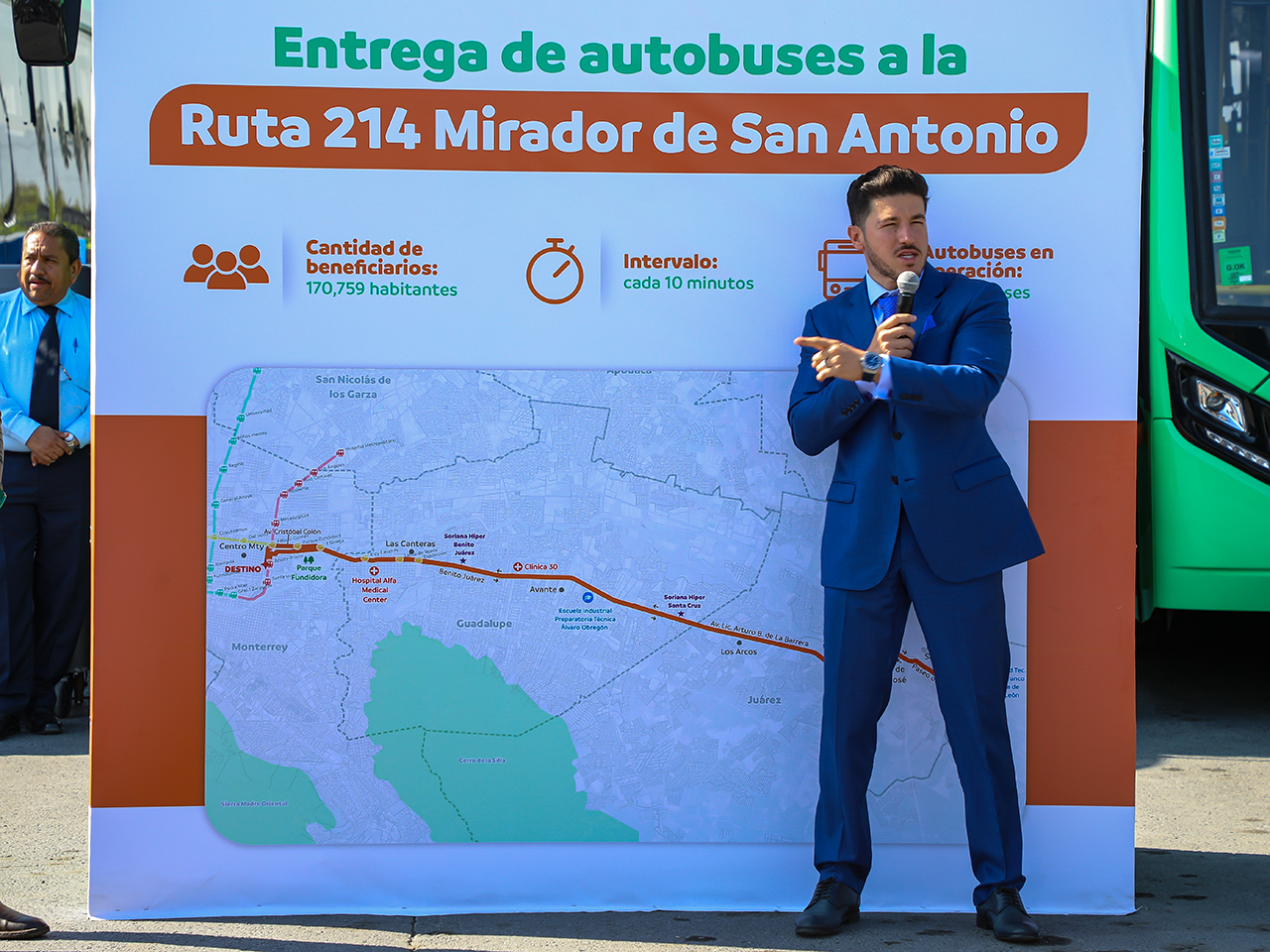 Guadalupe, Nuevo León.- Continuando con la reestructura del transporte y con fin de disminuir los tiempos de espera de los usuarios, el Gobernador de Nuevo León, Samuel Alejandro García Sepúlveda entregó 20 nuevas unidades a la ruta 214 Mirador de San Antonio, que brindará servicio en Juárez, Guadalupe y Monterrey.