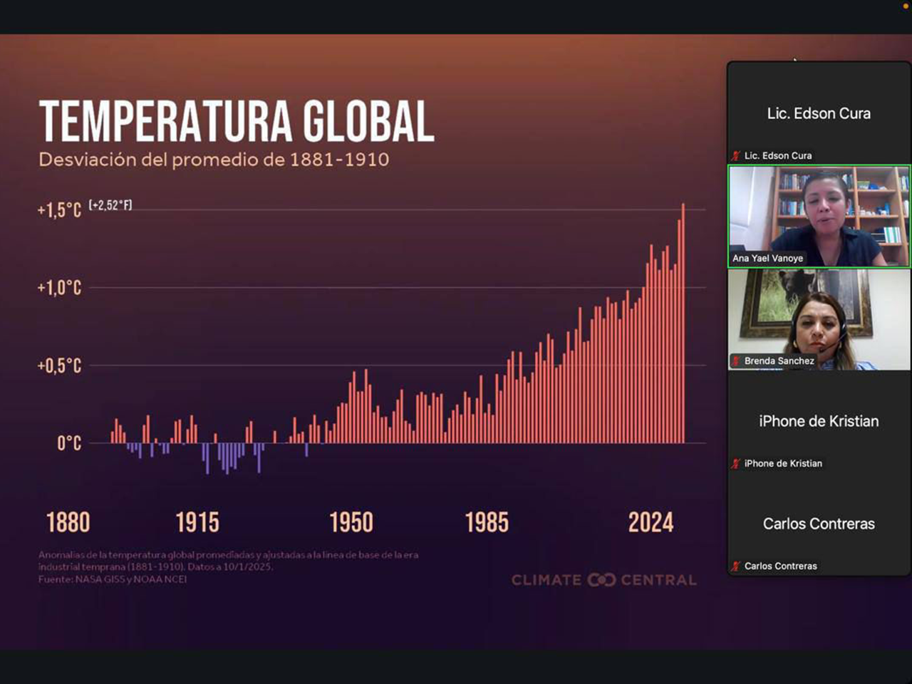 Impartieron las conferencias Justicia Climática, Marco Normativo del Cambio Climático, mitigación adaptación climática, Gobernanza Climática Municipal, la Dra  Ana Yael Vanoye García, Ing. Ignacio Legarreta Catillo, Ing. Cristina   Hernández Cardel y Mtra. Brenda Sánchez.