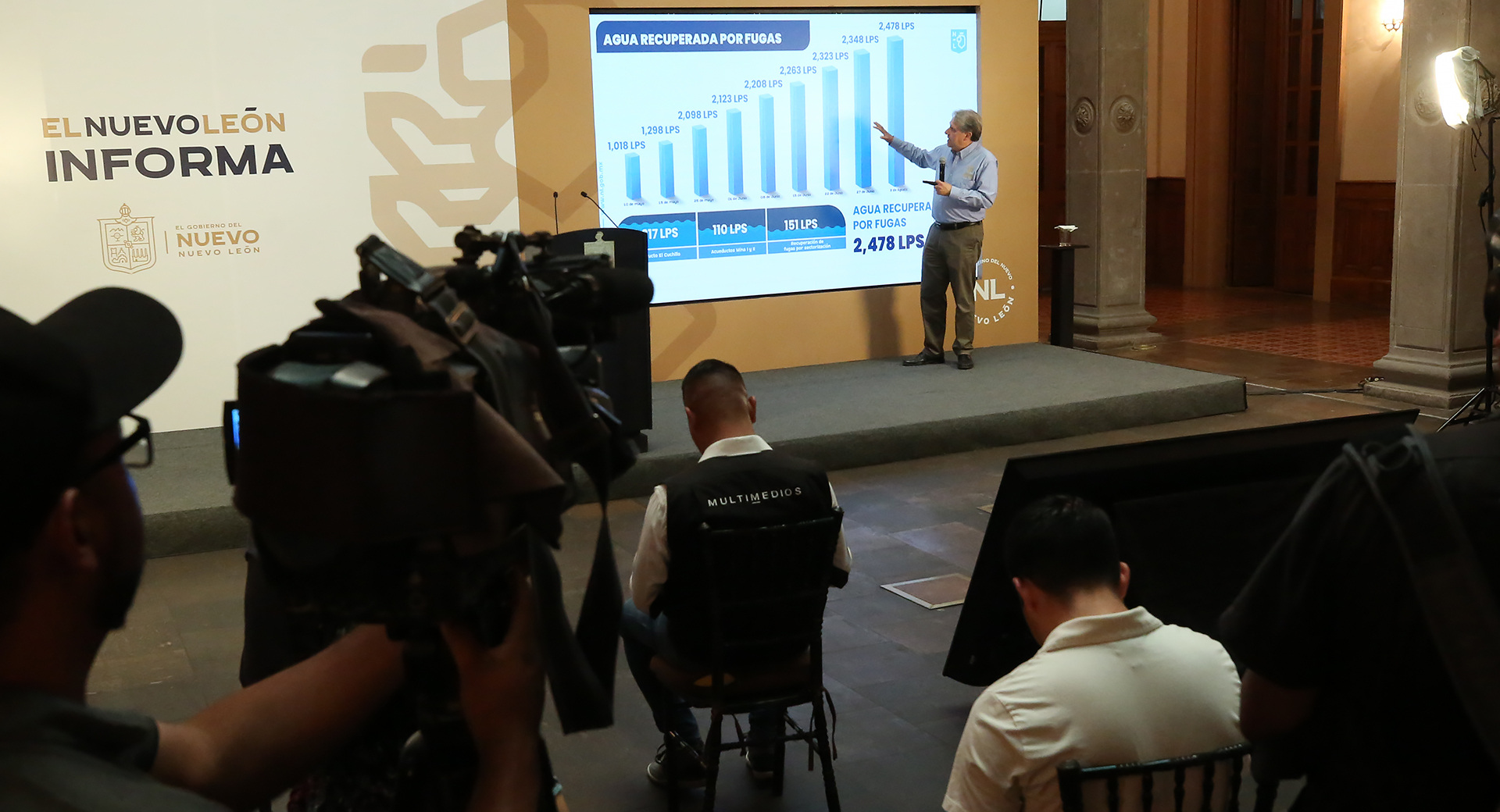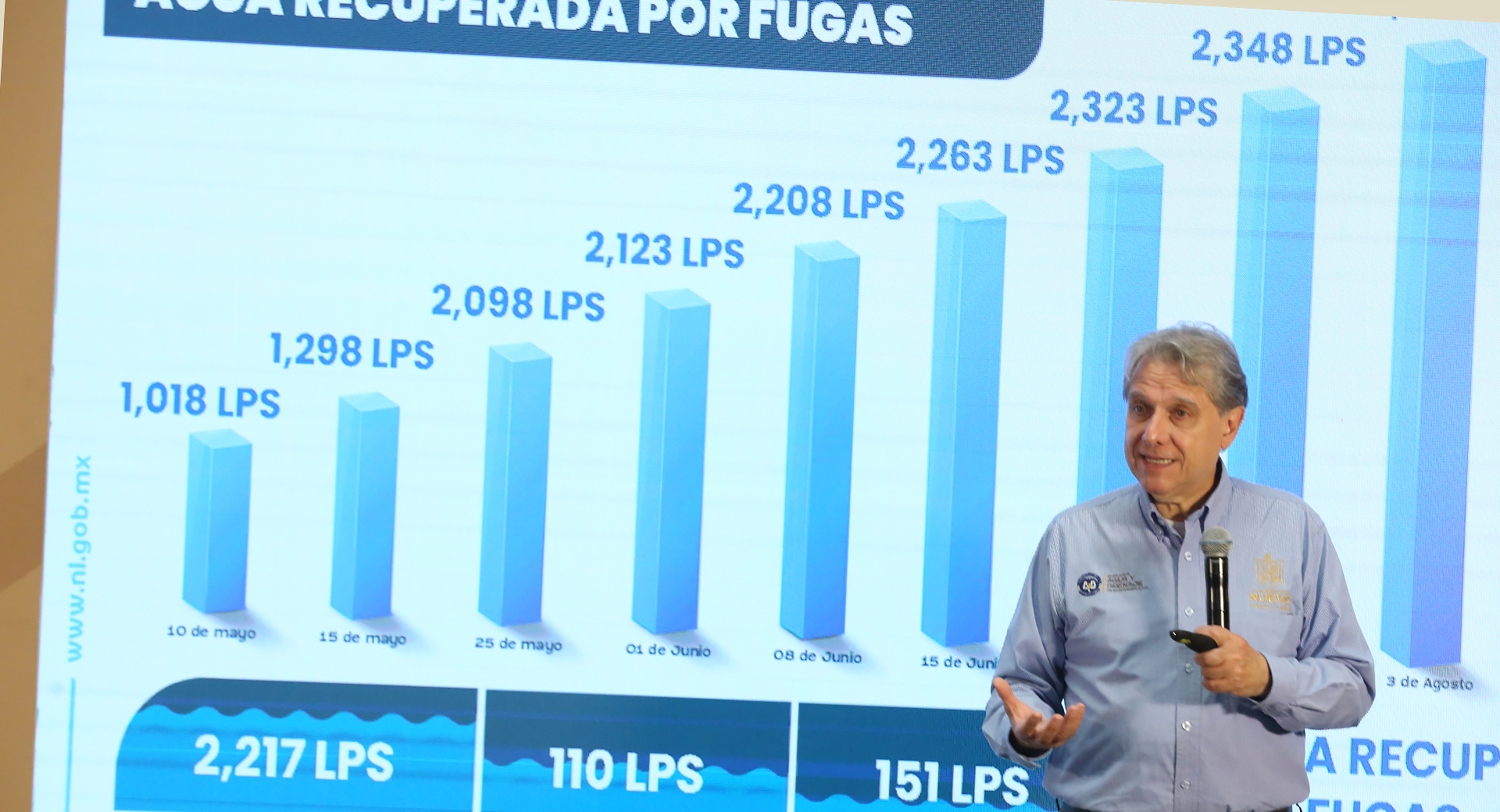 En cuanto al tema de agua recuperada en fugas, el Director General de AyD mencionó que se han tenido avances muy importantes, registrando hasta el día de hoy una cifra de 2 mil 478 litros por segundo. En el Acueducto El Cuchillo se han recuperado 2 mil 217 litros por segundo, en el Acueducto Mina I y II 110 y, dentro de la ciudad 151 litros adicionales.