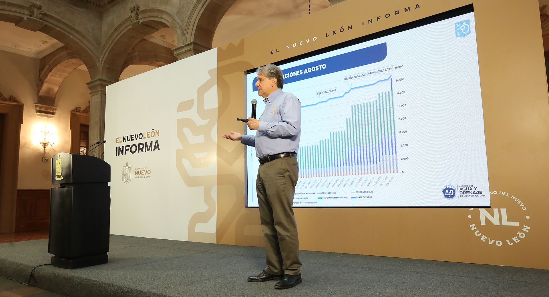En la rueda de prensa Nuevo León Informa, el funcionario estatal estimó que todos estos esfuerzos ayudarán a lograr que el próximo 10 de agosto se tenga un caudal aproximadamente de 12 mil 949 litros por segundo; el 22 de agosto se llegue a los 14 mil 204 litros; y el día 04 de septiembre a 15 mil 004 litros. Por otro lado, Barragán Villarreal indicó que se han incorporado 77 pozos que aportan un afluente de mil 189 litros por segundo a la red de distribución.