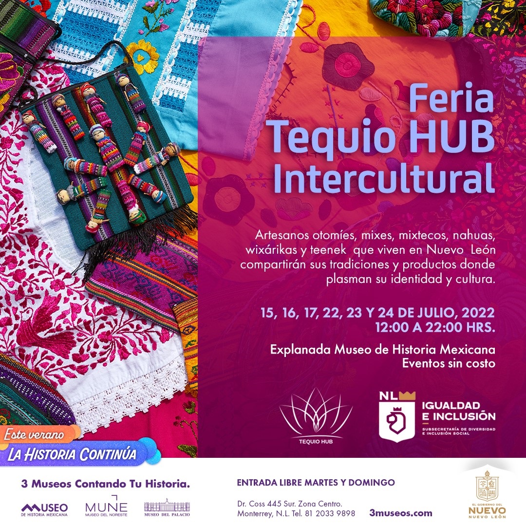 Por otra parte, en coordinación con la Secretaría de Igualdad e Inclusión y con motivo del Día Internacional de los Pueblos Indígenas, que se celebra el 9 de agosto, se llevará a cabo Feria Tequio HUB Intercultural, en la cual participan artesanos otomíes, mixes, mixtecos, nahuas, wixárikas y teenek que actualmente radican en Nuevo León y que ofrecerán sus productos en la Explanada del Museo de Historia Mexicana del 29 al 31 de julio y 5 al 7 de agosto 2022.