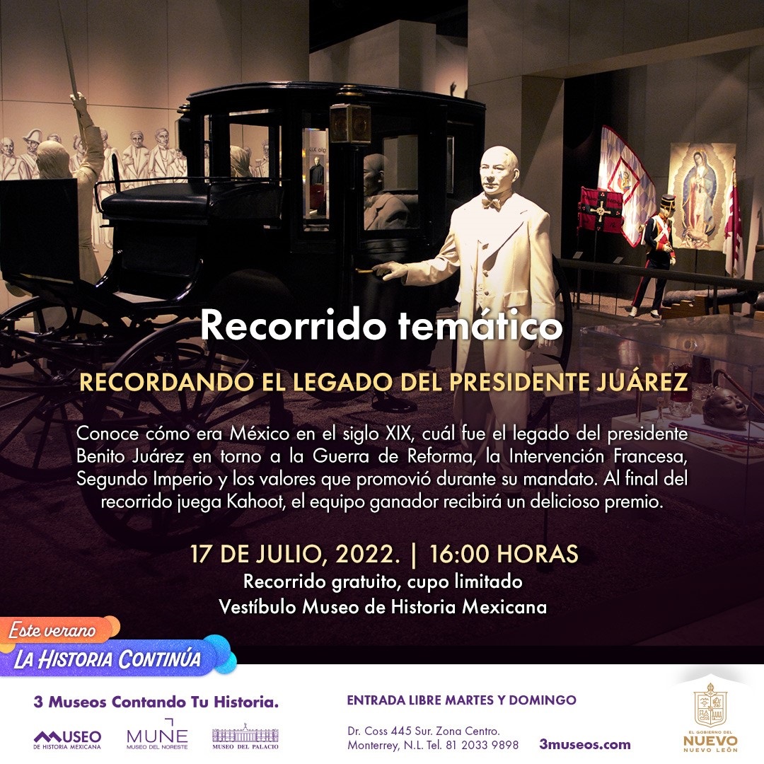 En El legado del presidente Juárez, el domingo 17 de julio a las 16:00 horas, se conocerá la historia de la Guerra de Reforma, la Intervención Francesa y el Segundo Imperio; así como los valores del gobierno del presidente Benito Juárez. Al final, los equipos competirán para poner a prueba sus conocimientos y ganar un premio.