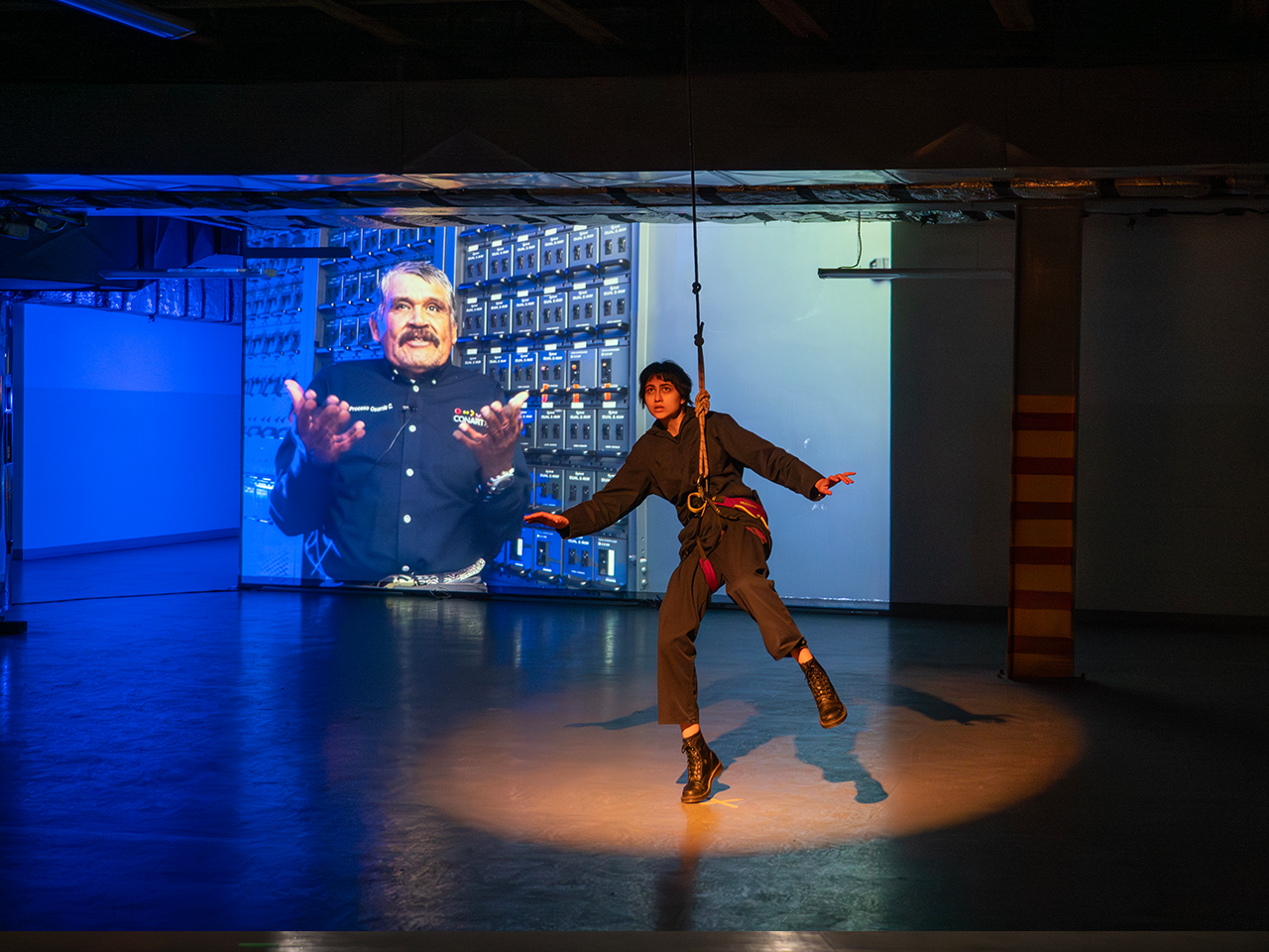 “Pioneros del espacio interior”, de Mónica Jasso, es una pieza creada a partir de entrevistas videograbadas con técnicos del Teatro de la Ciudad en la que esta tripulación de técnicos del espacio teatral recibe una llamada y en respuesta, dirigen la nave escénica a un territorio inexplorado.