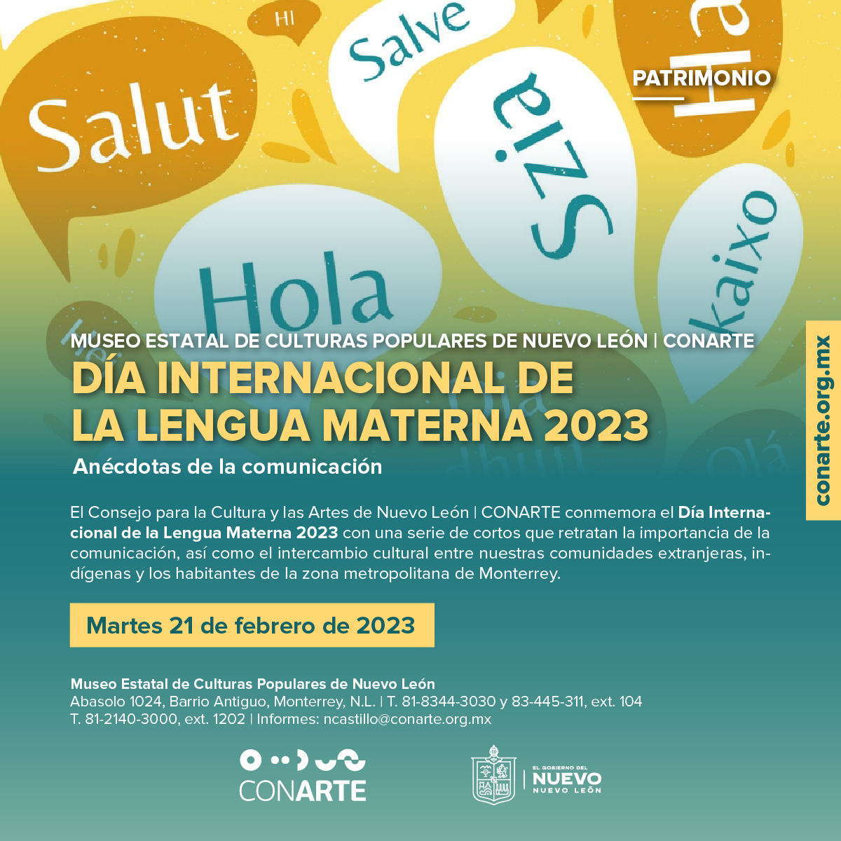 Bajo la premisa de que las lenguas y el plurilingüismo fomentan la inclusión, el Consejo para la Cultura y las Artes de Nuevo León | CONARTE se une a la celebración del Día Internacional de la Lengua Materna 2023, mediante una campaña audiovisual que, a través de las plataformas virtuales de CONARTE, busca difundir y sensibilizar a las nuevas generaciones respecto al tema.