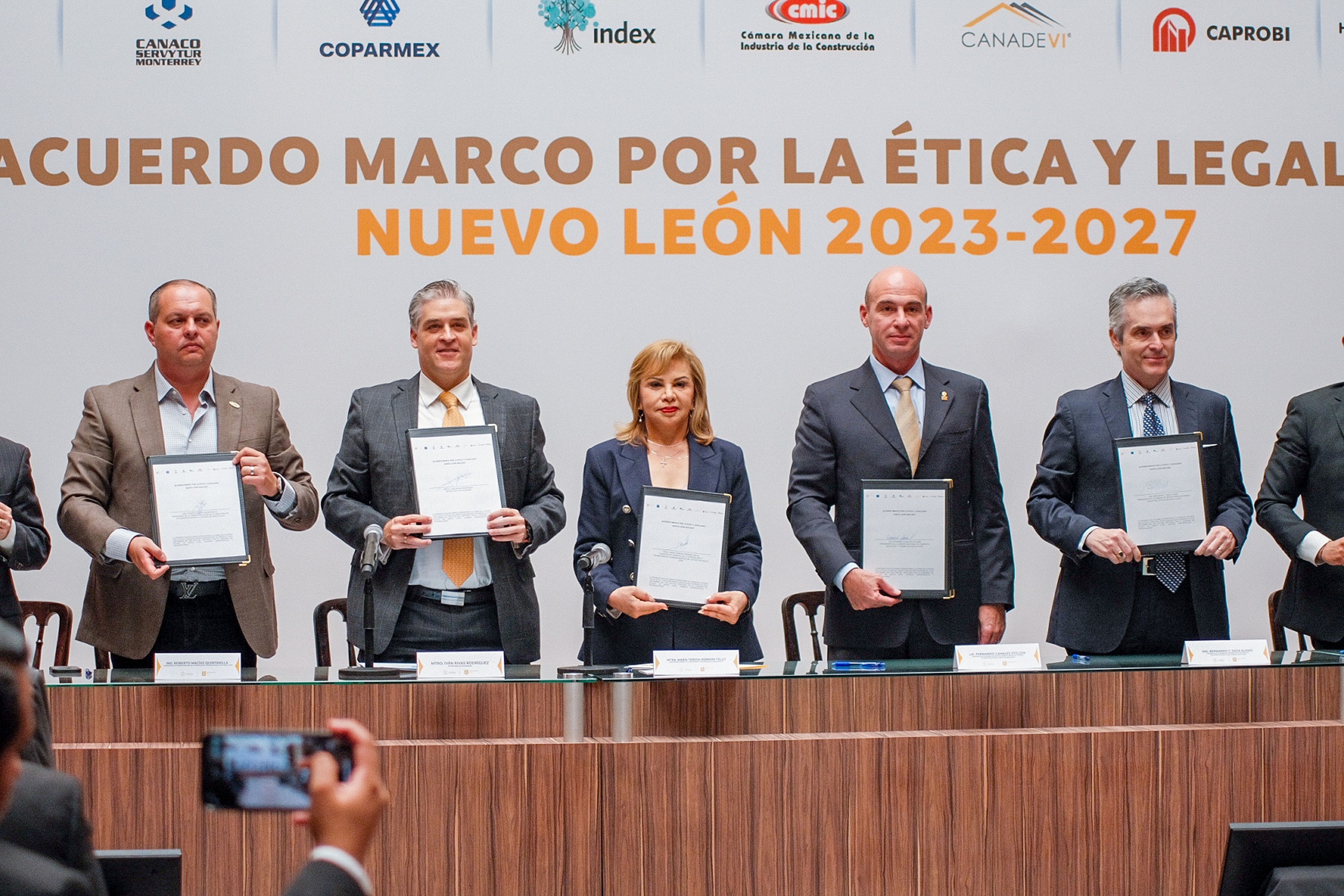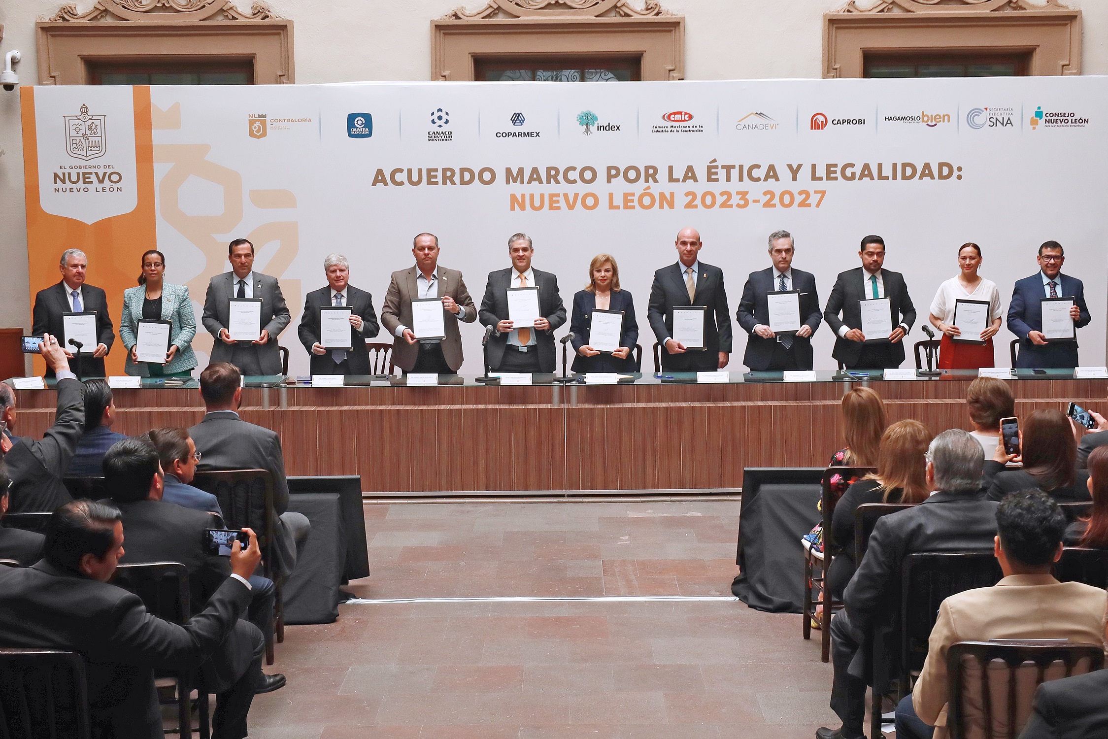 Monterrey, Nuevo León.- Con la firme intención de crear una sociedad integra el Gobierno del Estado, a través de la Contraloría y Transparencia Gubernamental firmó el Acuerdo por la Ética y la Legalidad Nuevo León 2023-2027, con las cámaras empresariales y organismos internacionales.