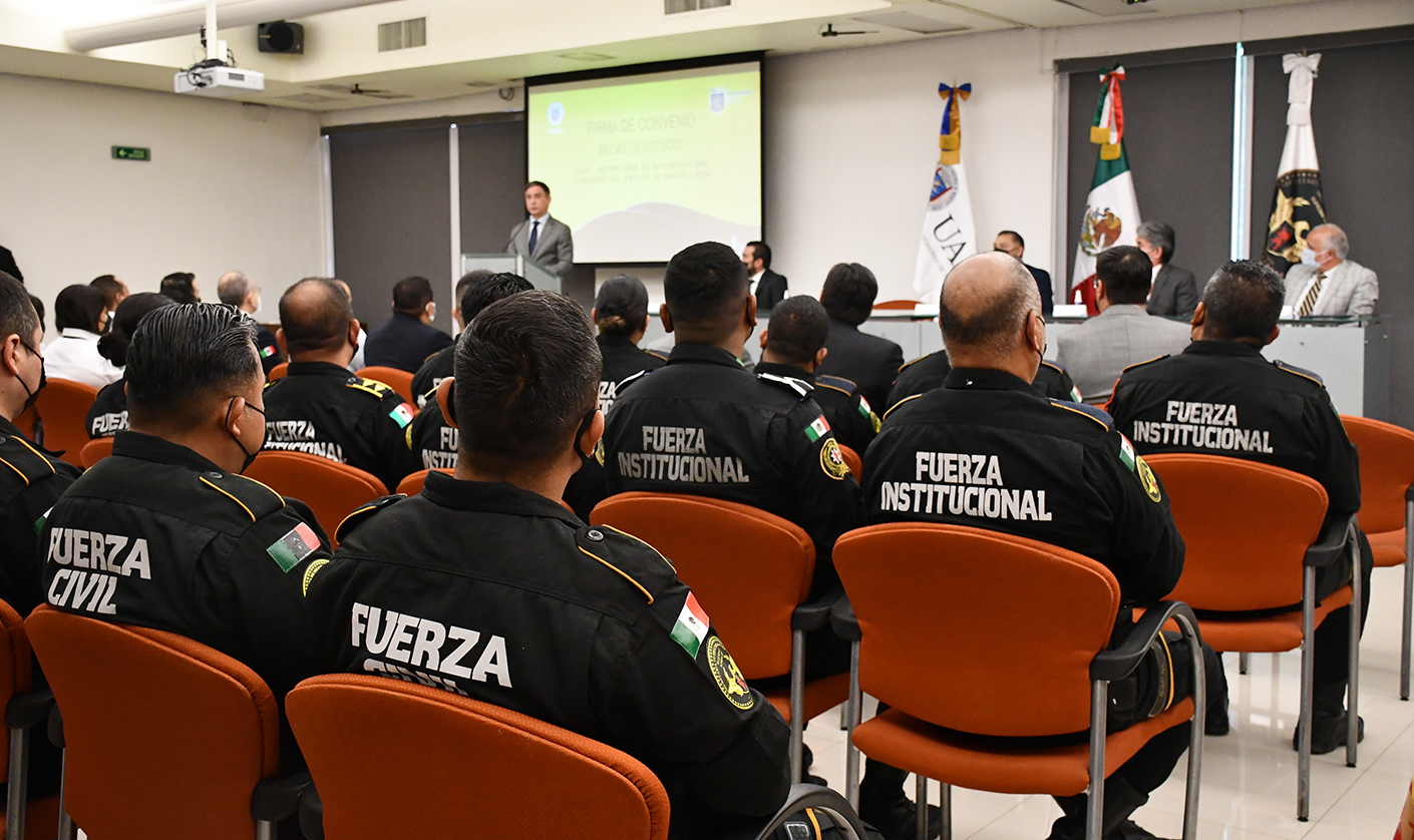 Con el propósito de seguir apoyando al personal operativo y administrativo de la Secretaría de Seguridad, el secretario Aldo Fasci Zuazua y el rector de la Universidad Autónoma de Nuevo León, Santos Guzmán López firmaron un convenio para otorgar becas del 100 por ciento para nivel medio superior y licenciatura.