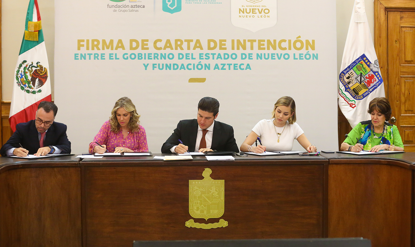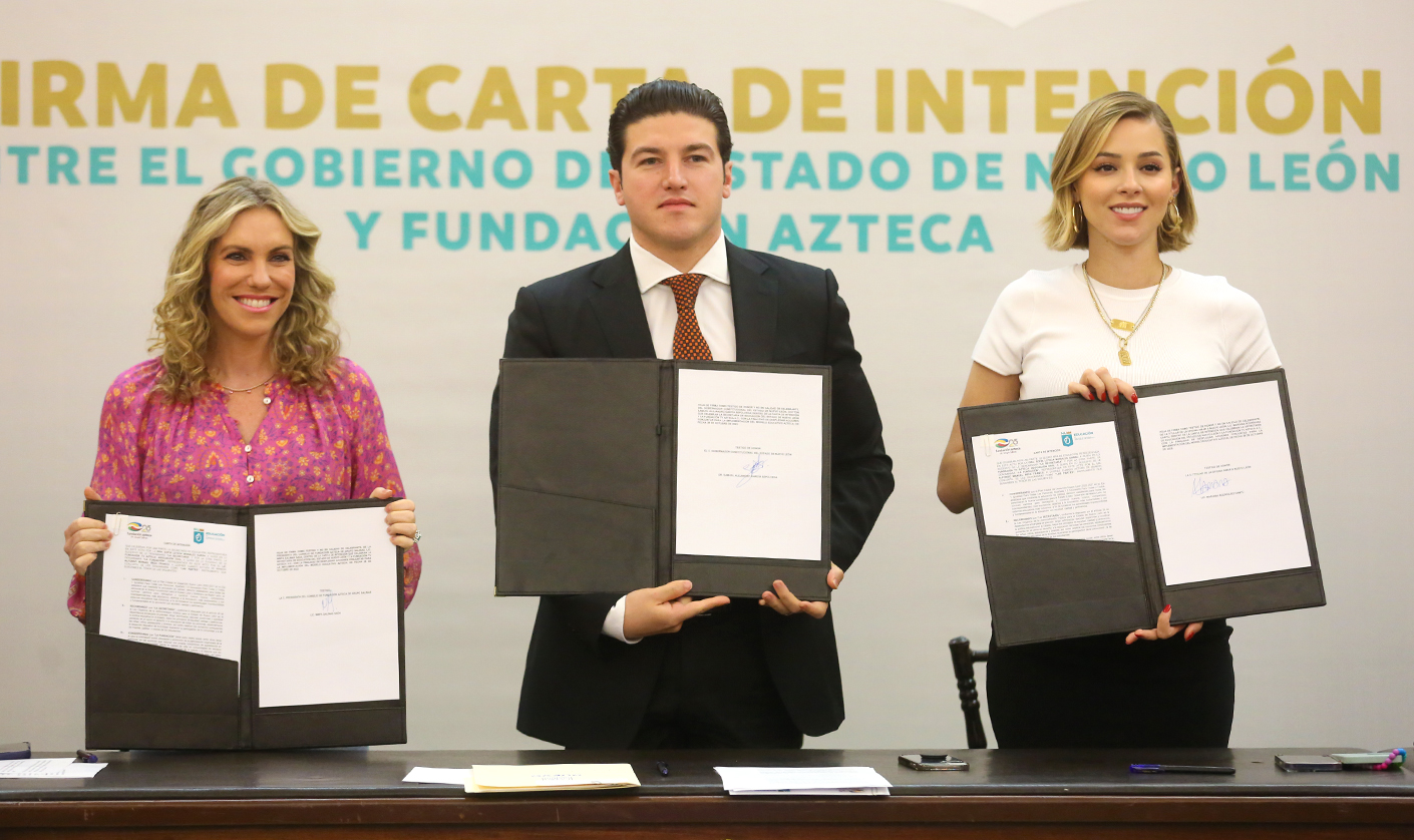 El acuerdo fue firmado por el Gobernador Samuel Alejandro García Sepúlveda y Mariana Rodríguez, de Amar a Nuevo León; Sofialeticia Morales Garza, Secretaria de Educación; Ninfa Salinas Sada, presidenta del Consejo de Fundación Azteca; y Antonio Domínguez Sagols, Director General de Fundación Azteca.