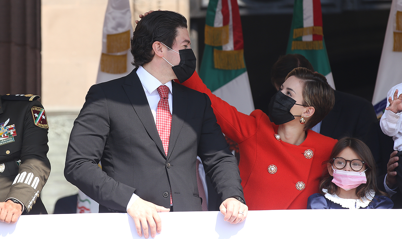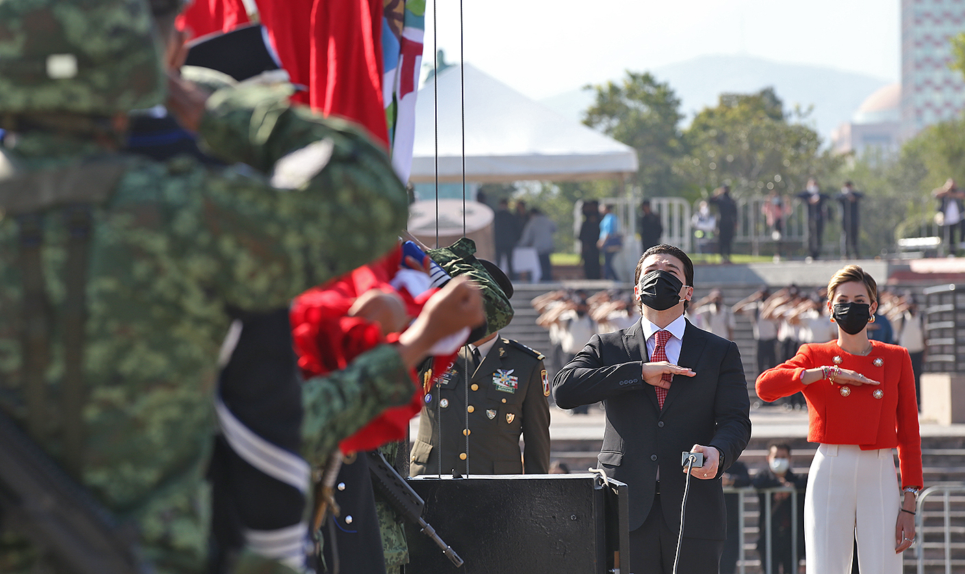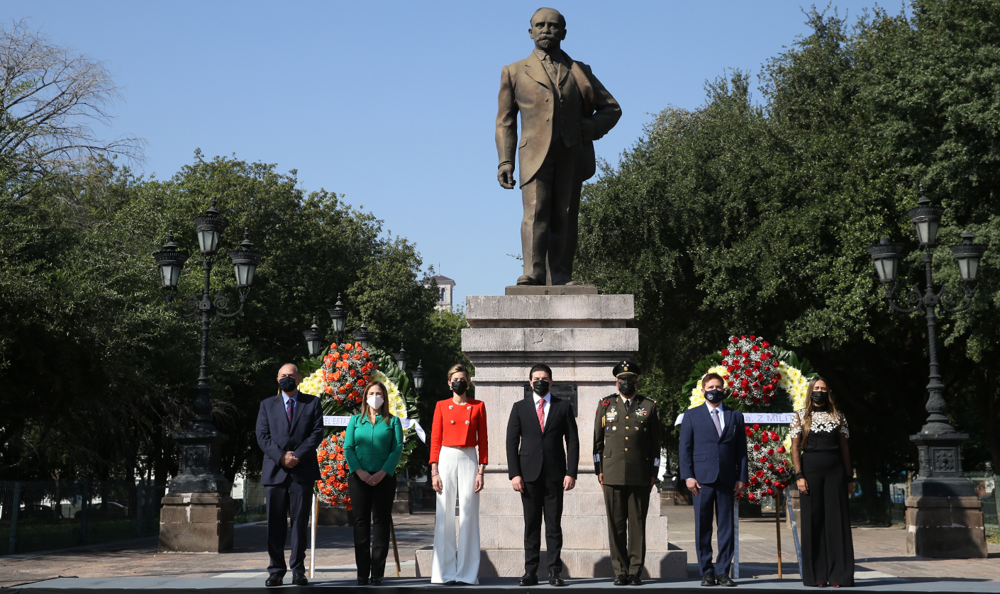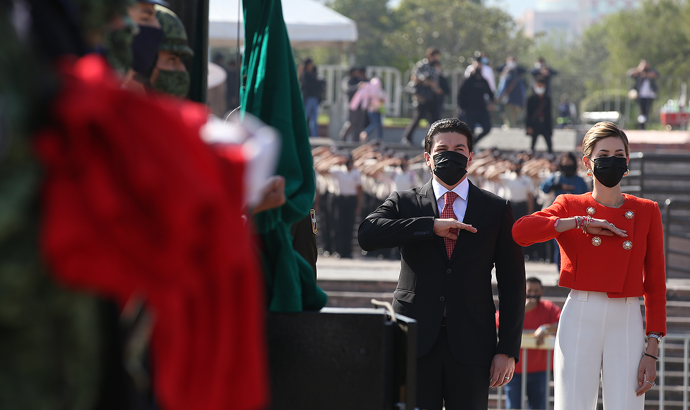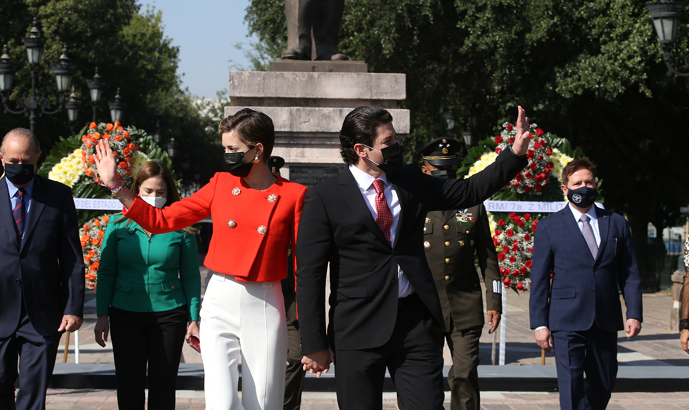 Acompañado de su esposa la titular de la oficina AMAR a Nuevo León, Mariana Rodríguez Cantú y de funcionarios estatales y autoridades legislativas, judiciales y militares, el Mandatario estatal realizó el izamiento de la Bandera Nacional en el asta monumental, colocó una ofrenda florar y montó guarida de honor ante el monumento a Don Francisco I. Madero.