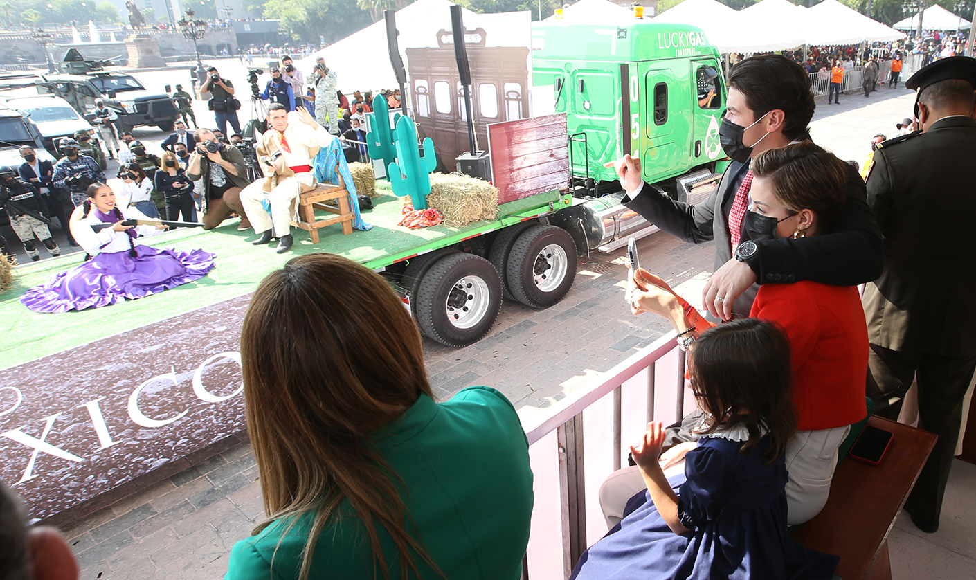 Posteriormente se dio el paso a cada uno de los contingentes que formaron la columna y en el que participaron alumnos de escuelas públicas y privadas, cuerpos policiacos, de auxilio y rescate, INDE, Sedena, Policía Militar, Guardia Nacional, y Pentatlón Deportivo Militarizado, y asociaciones de rodeo.