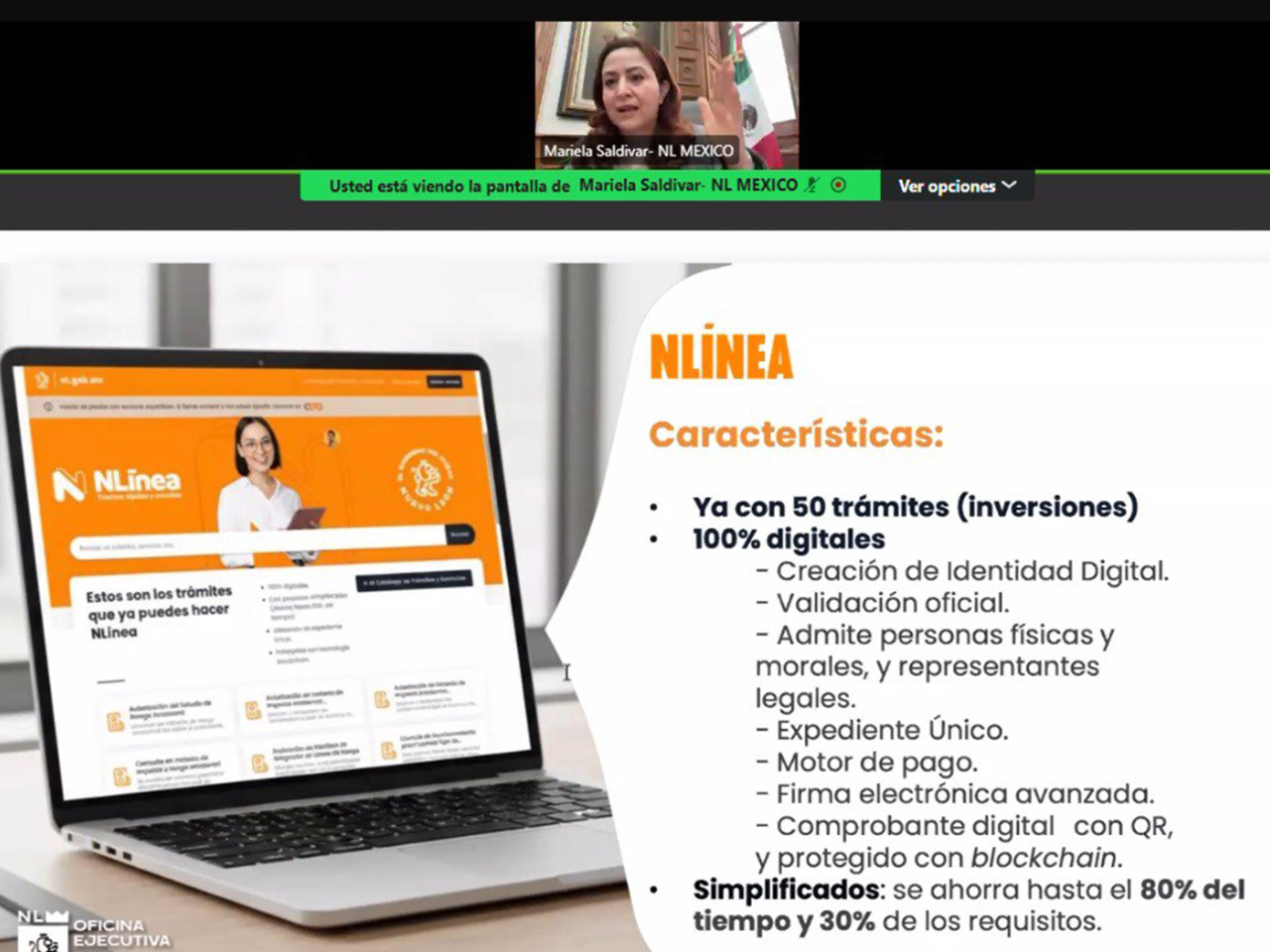 En su presentación, la Oficina Ejecutiva mostró en tiempo real las funcionalidades clave de NLínea: validación de identidad, expediente único, historial y seguimiento de trámites, enrolamiento de personas físicas y morales, interoperabilidad con otras plataformas, así como procesos que permiten reducir tiempos y ofrecer certidumbre a la ciudadanía y a las empresas gracias al uso de tecnología blockchain.