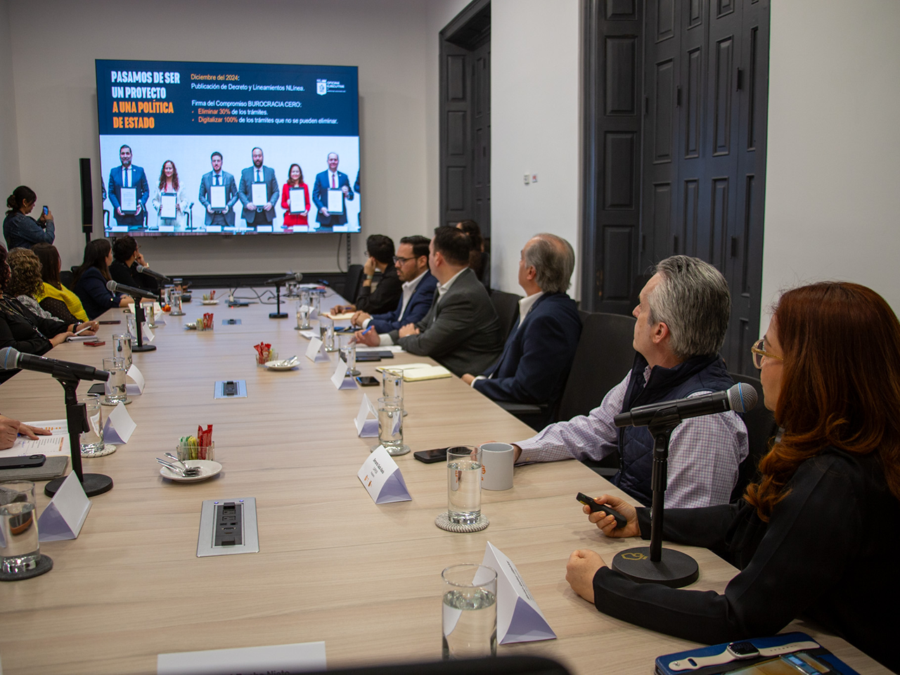 El encuentro fue encabezado por la Secretaria de Economía, Betsabé Rocha; la titular de la Oficina Ejecutiva, Mariela Saldívar; el Director General de la Comisión Estatal de Mejora Regulatoria, Julio Aguilar; y representantes de CAINTRA, CANACO, CANADEVI, CAPROBI, COPARMEX, INDEX y el Consejo Nuevo León.
