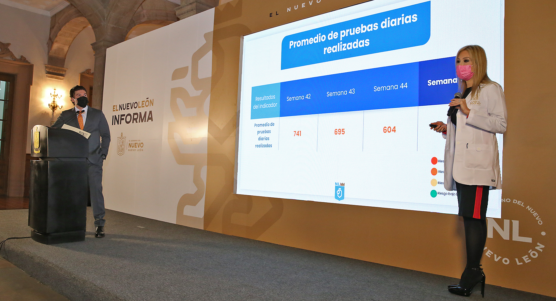 Mencionó que a la fecha, se registran 5 indicadores en color verde, 4 en amarillo y 1 en naranja, y que el estatus de éstos seguirá rigiendo los aforos en instituciones educativas, establecimientos, y eventos públicos y masivos en las siguientes semanas.