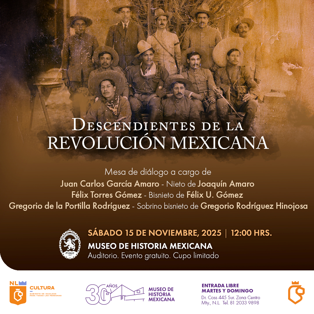 La charla “Descendientes de la Revolución Mexicana”, se realizará el sábado 15 de noviembre a las 10:30 horas en el Auditorio del Museo del Noreste con entrada libre.